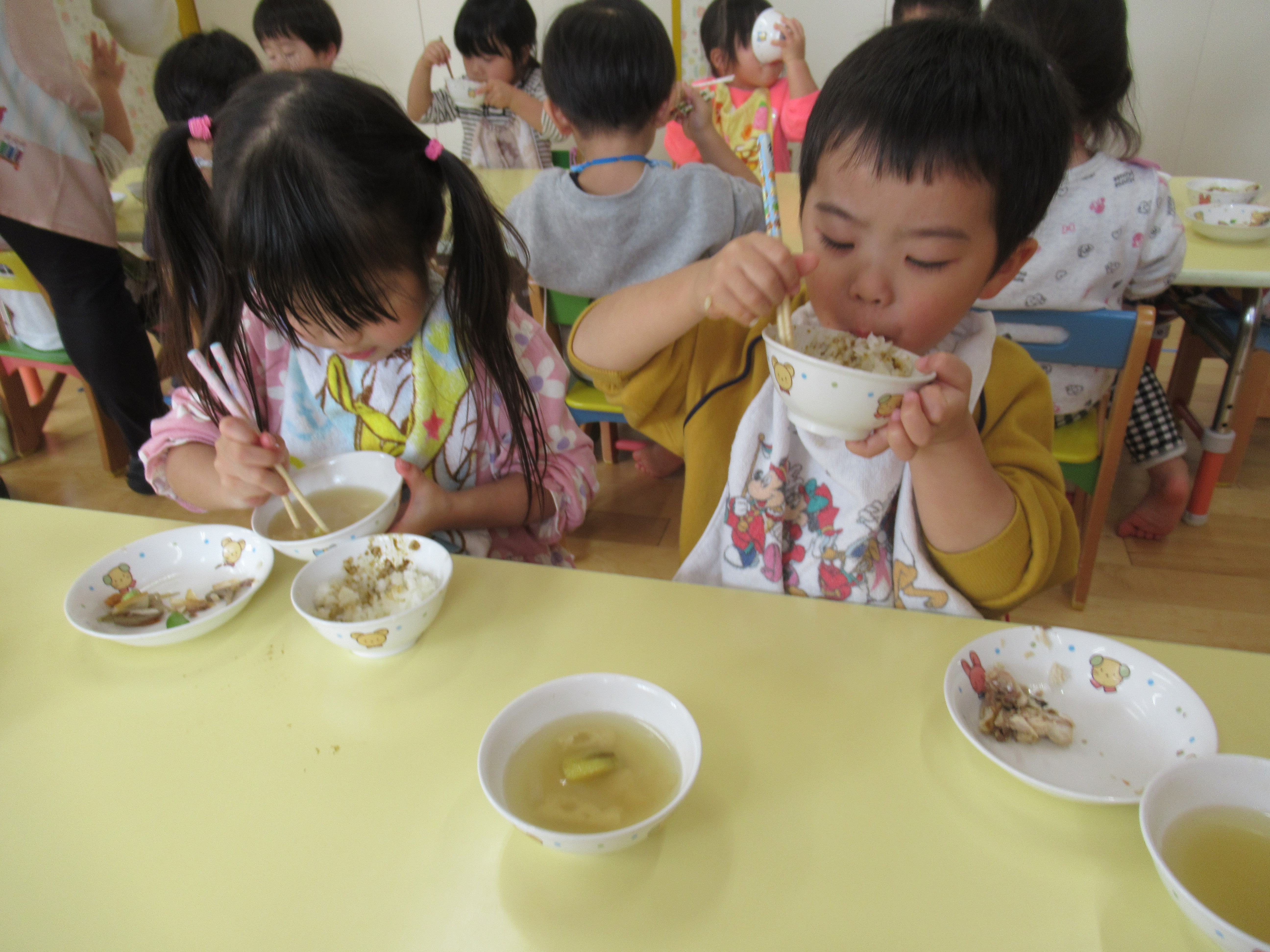お箸で給食をモリモリ食べてるよ(*^^*)