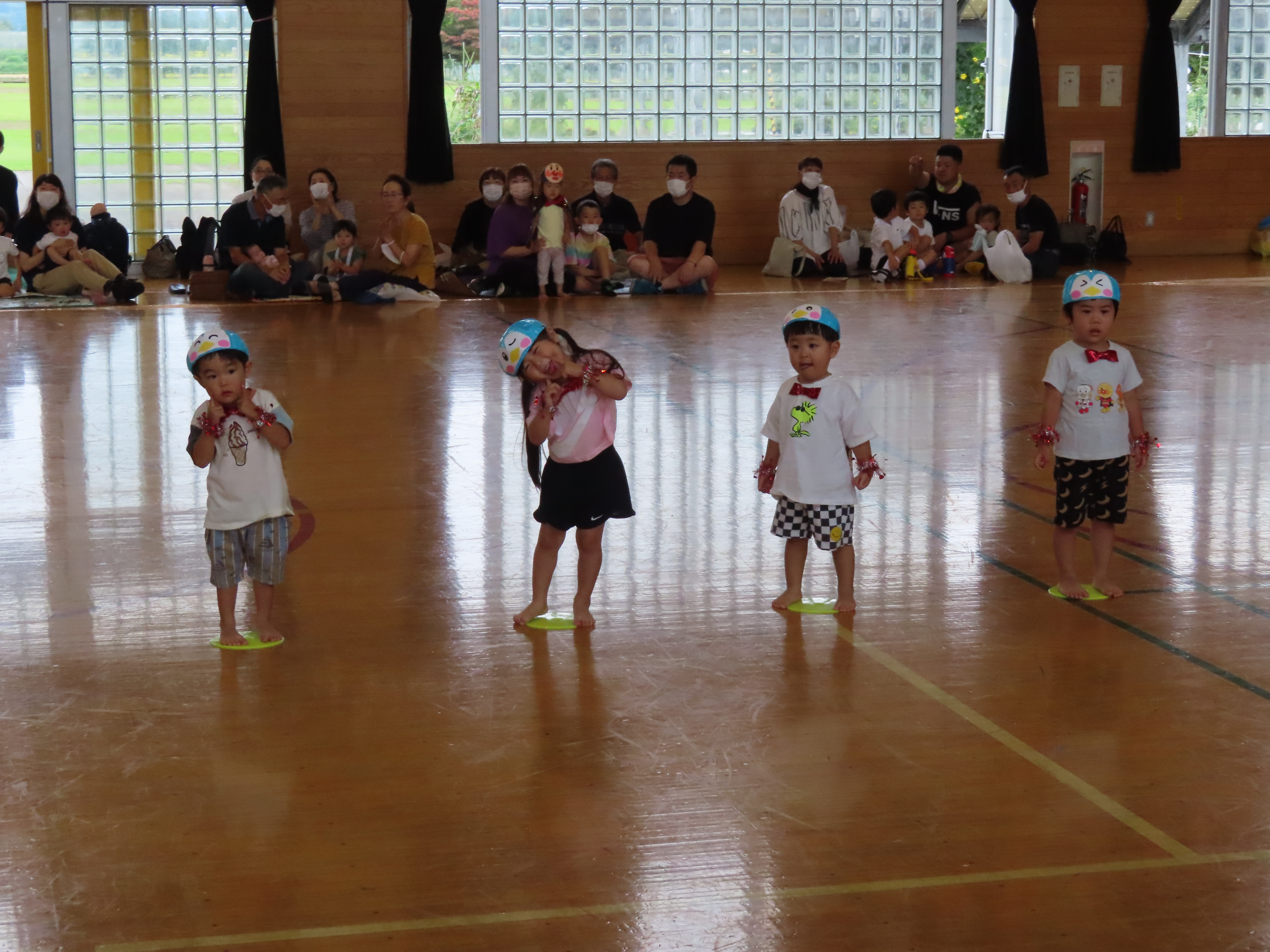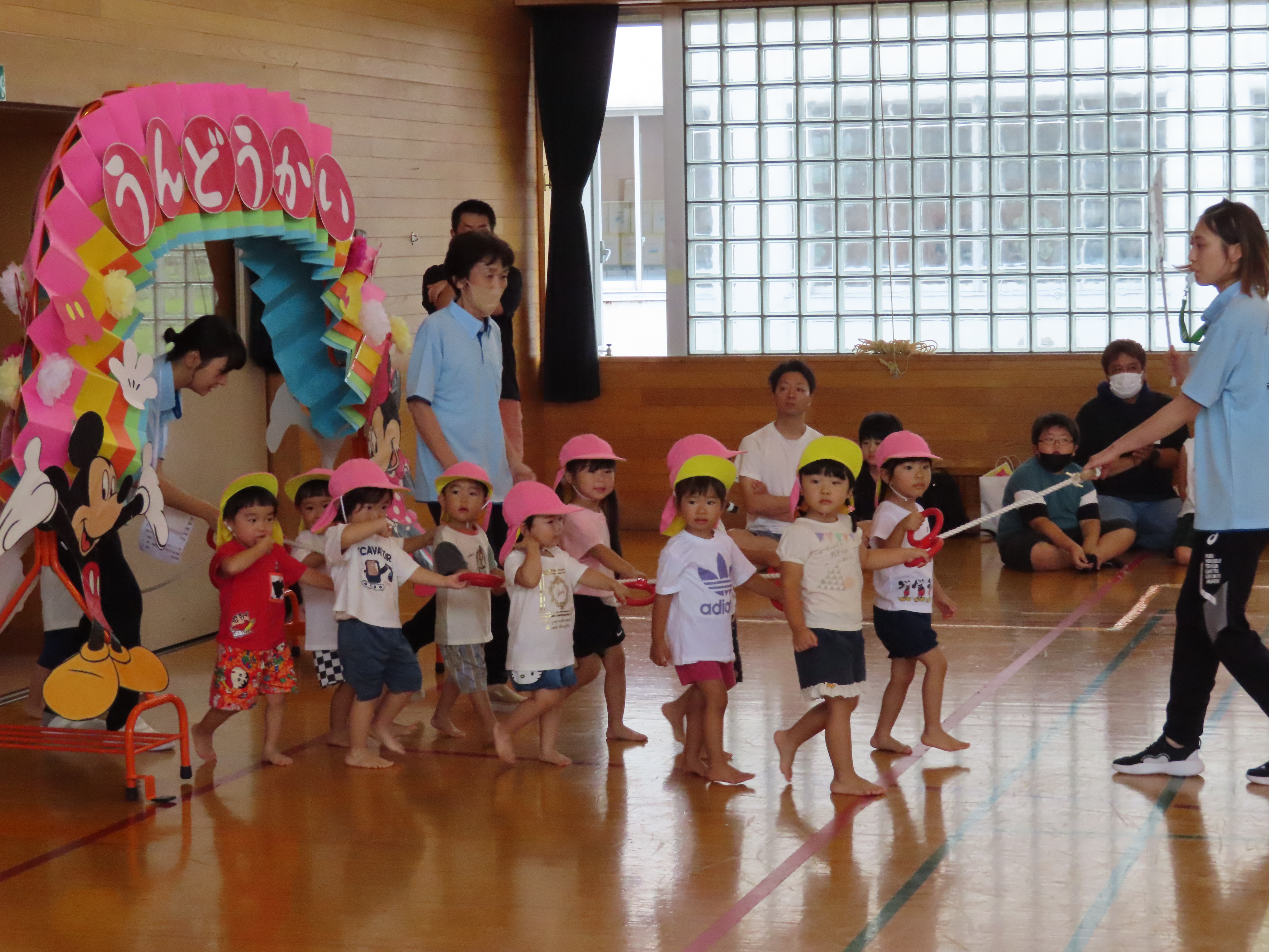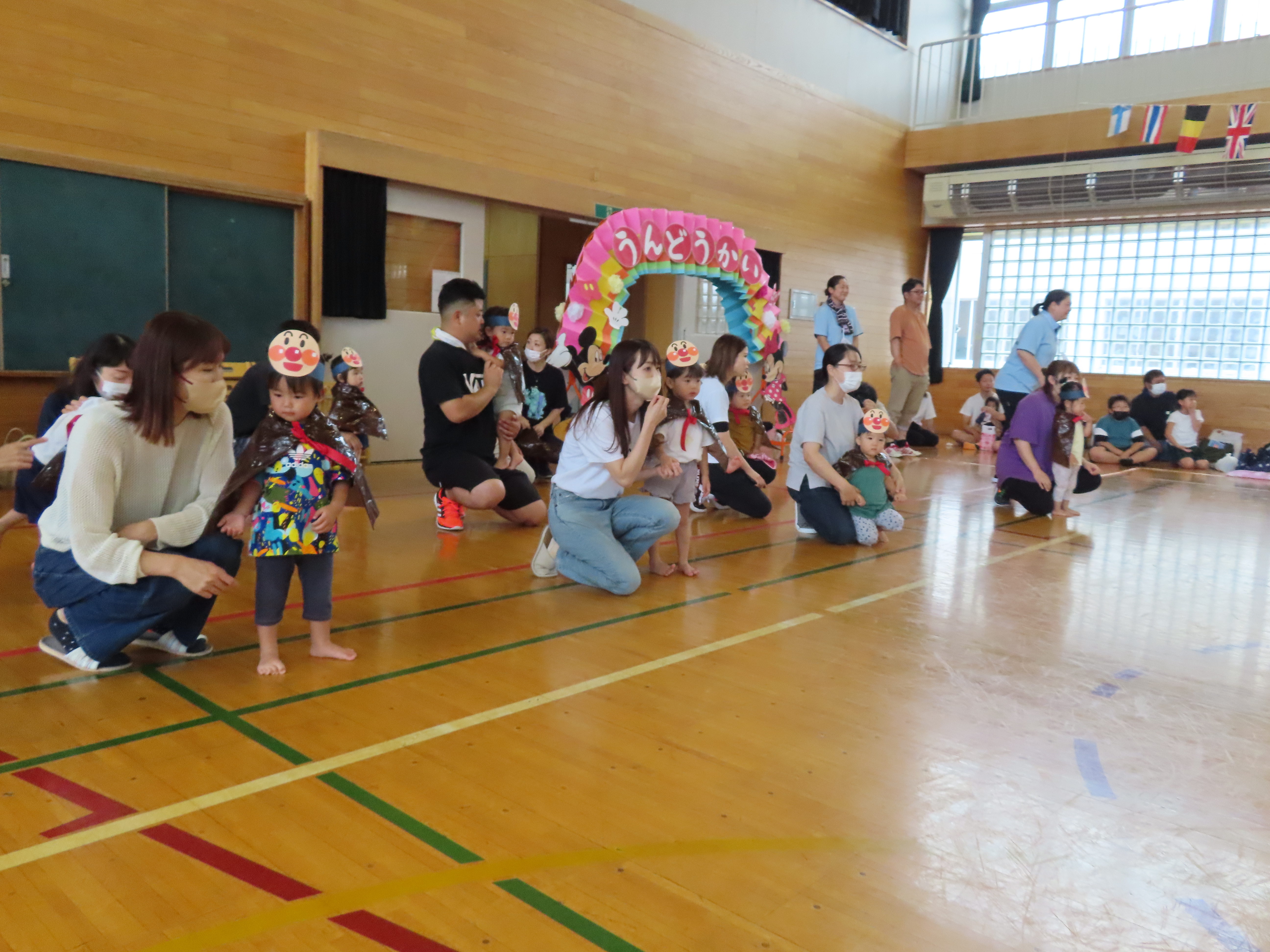 さくらんぼ・みかん組親子競技。「進め!アンパンマン」