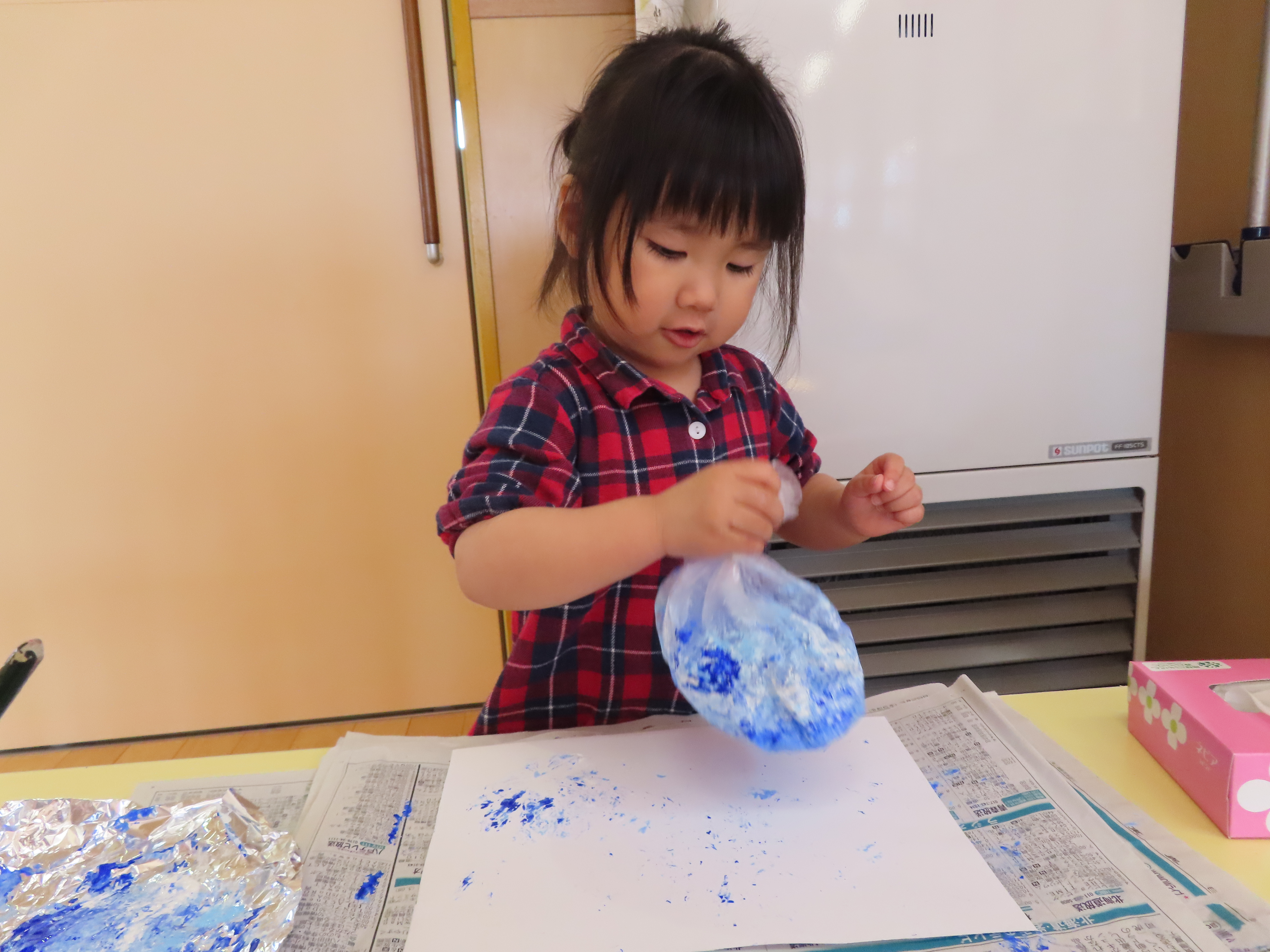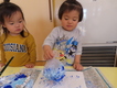 ナイロン袋に絵の具を付けてペタペタ・・・。