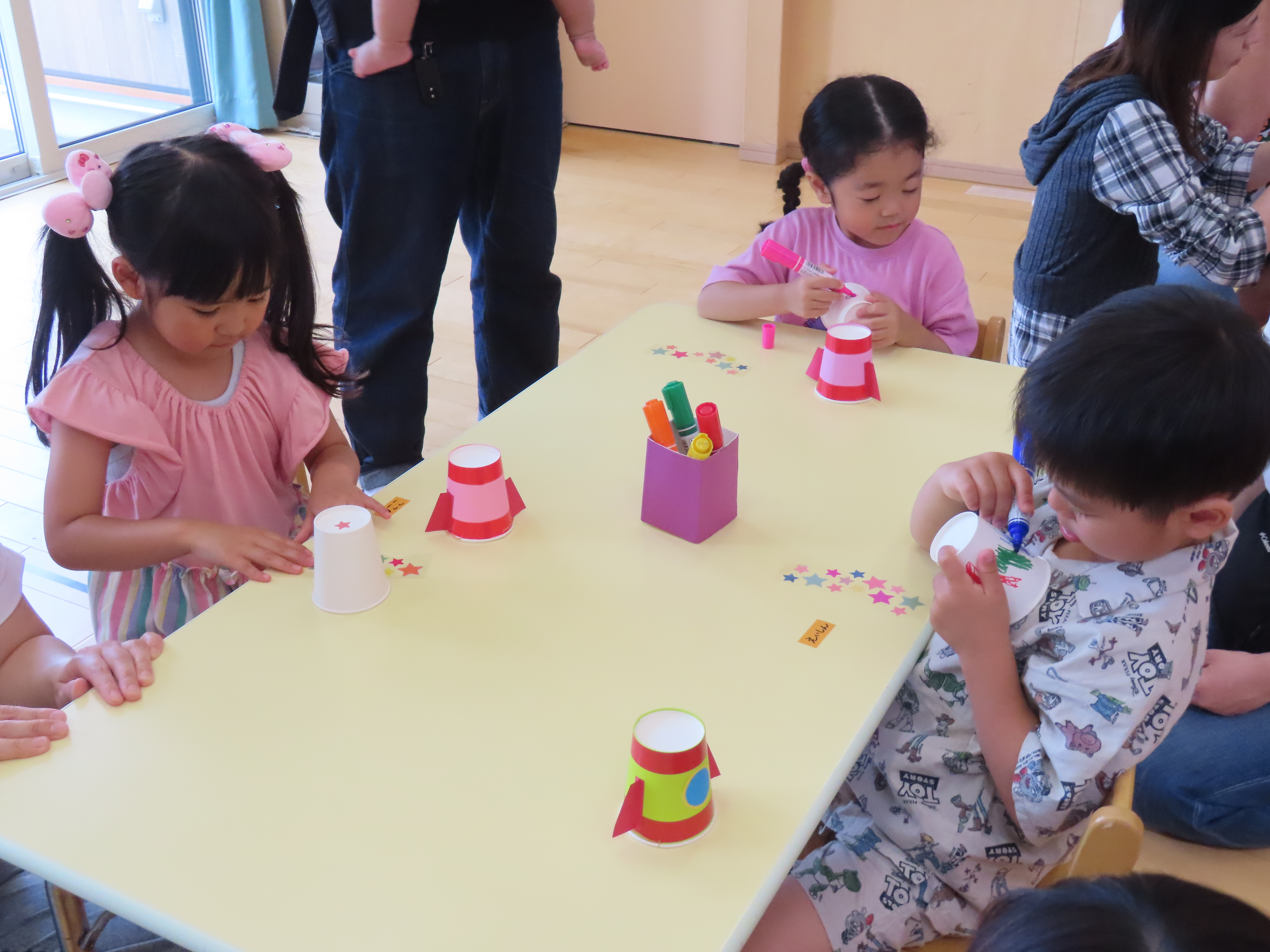 紙コップに模様を書たり、シールを貼ったりして完成!