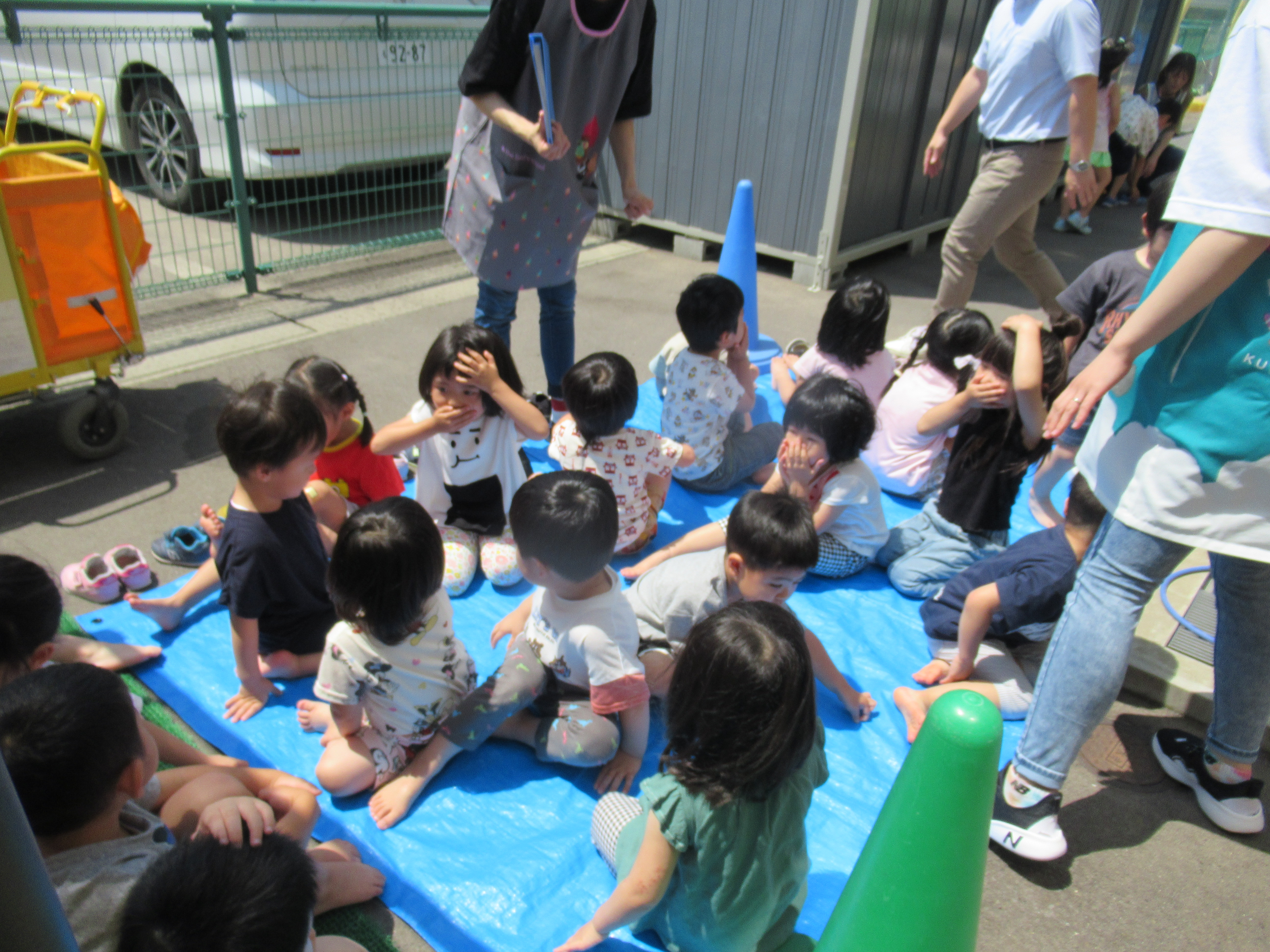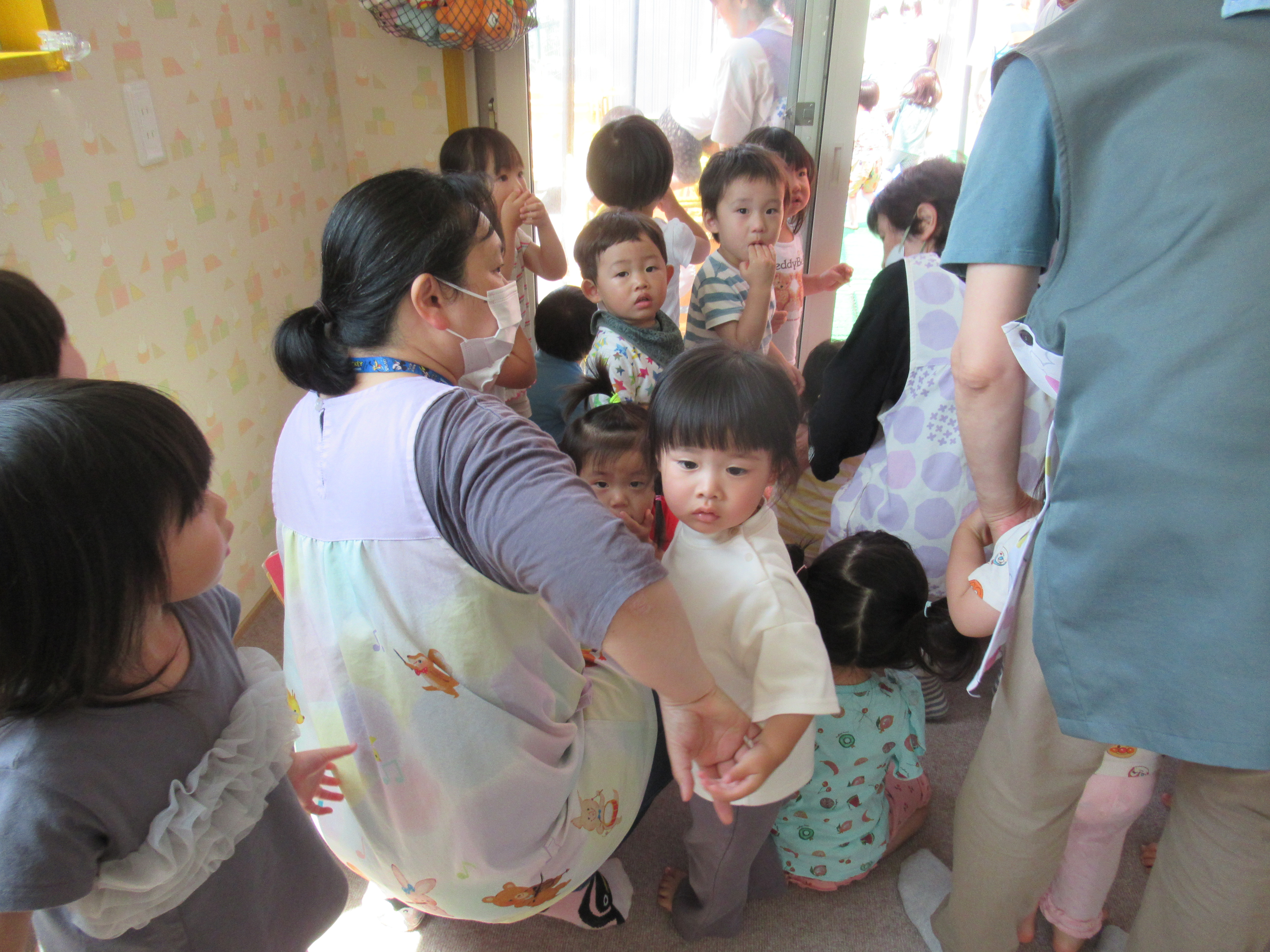 未満児組も園舎の外へ。