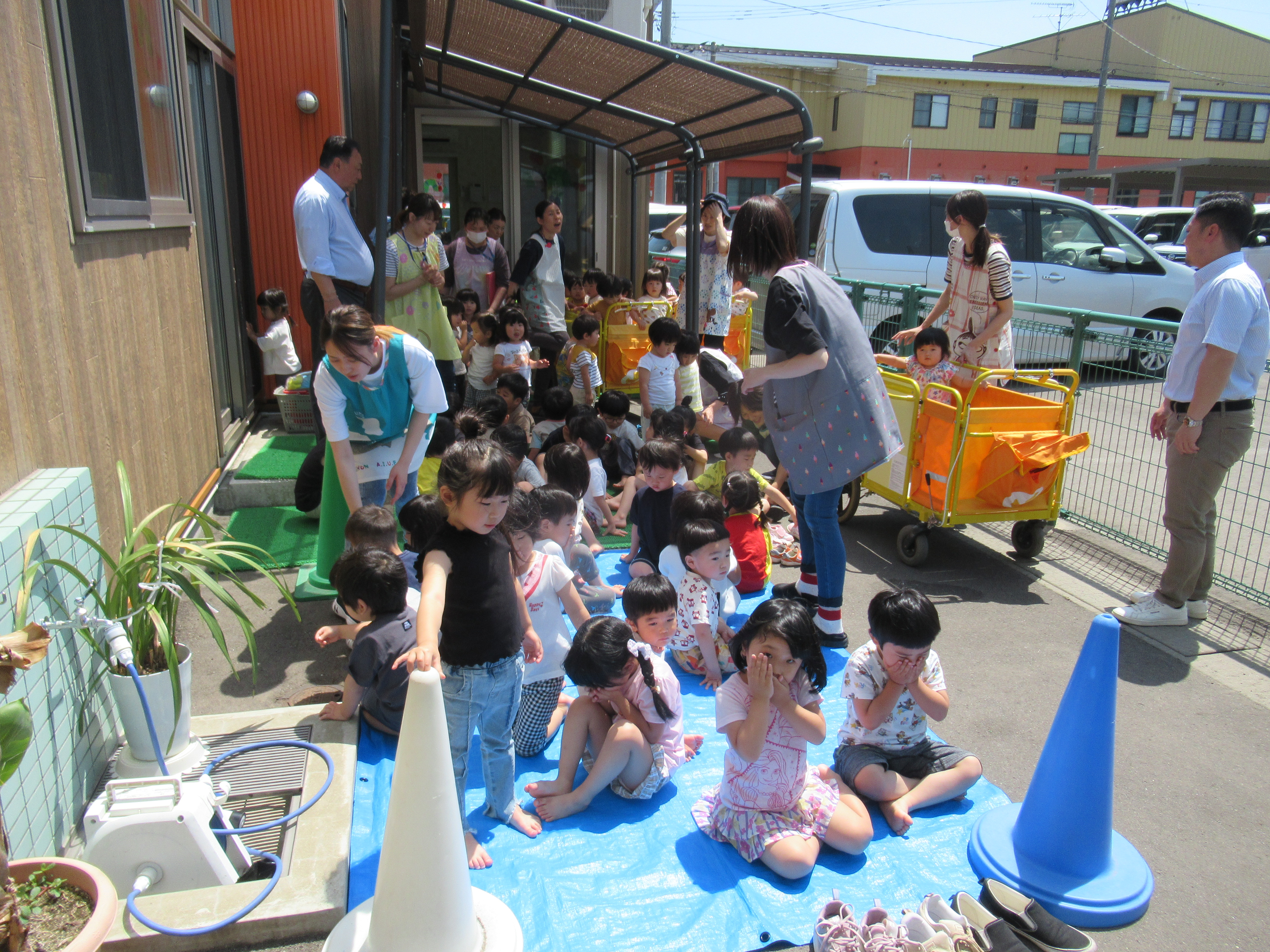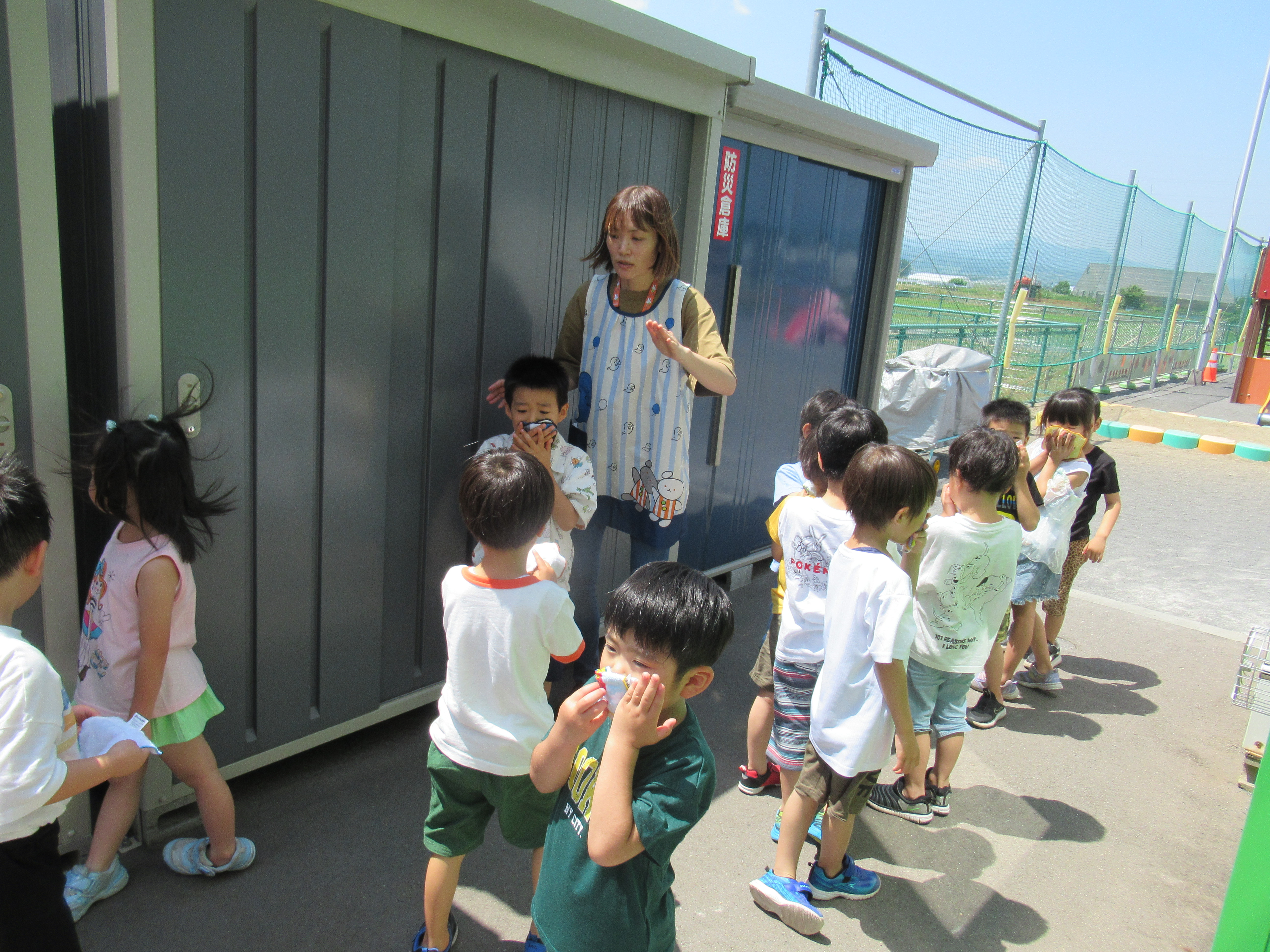 各クラスとも園舎の外へ無事に避難。
