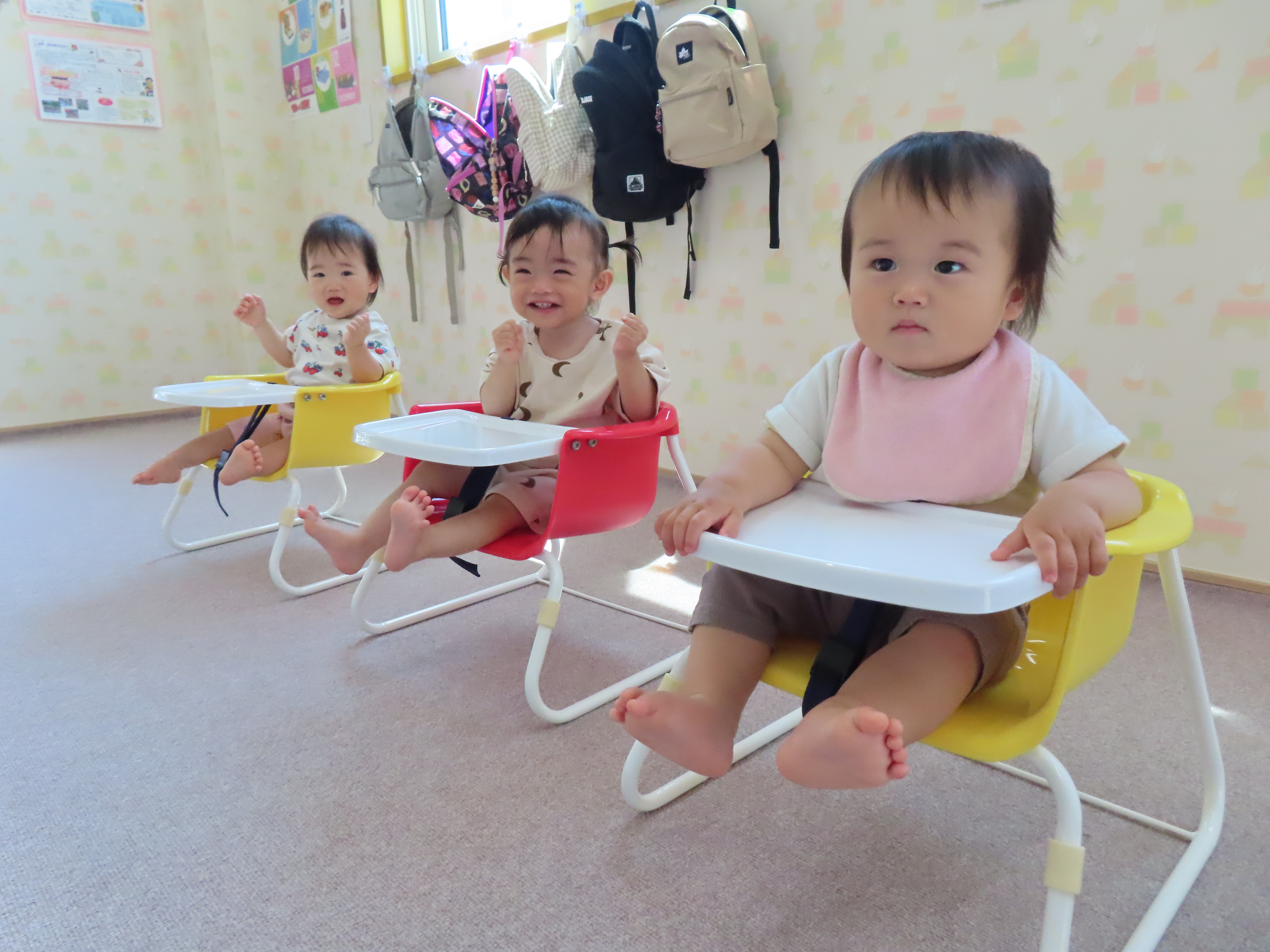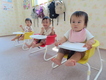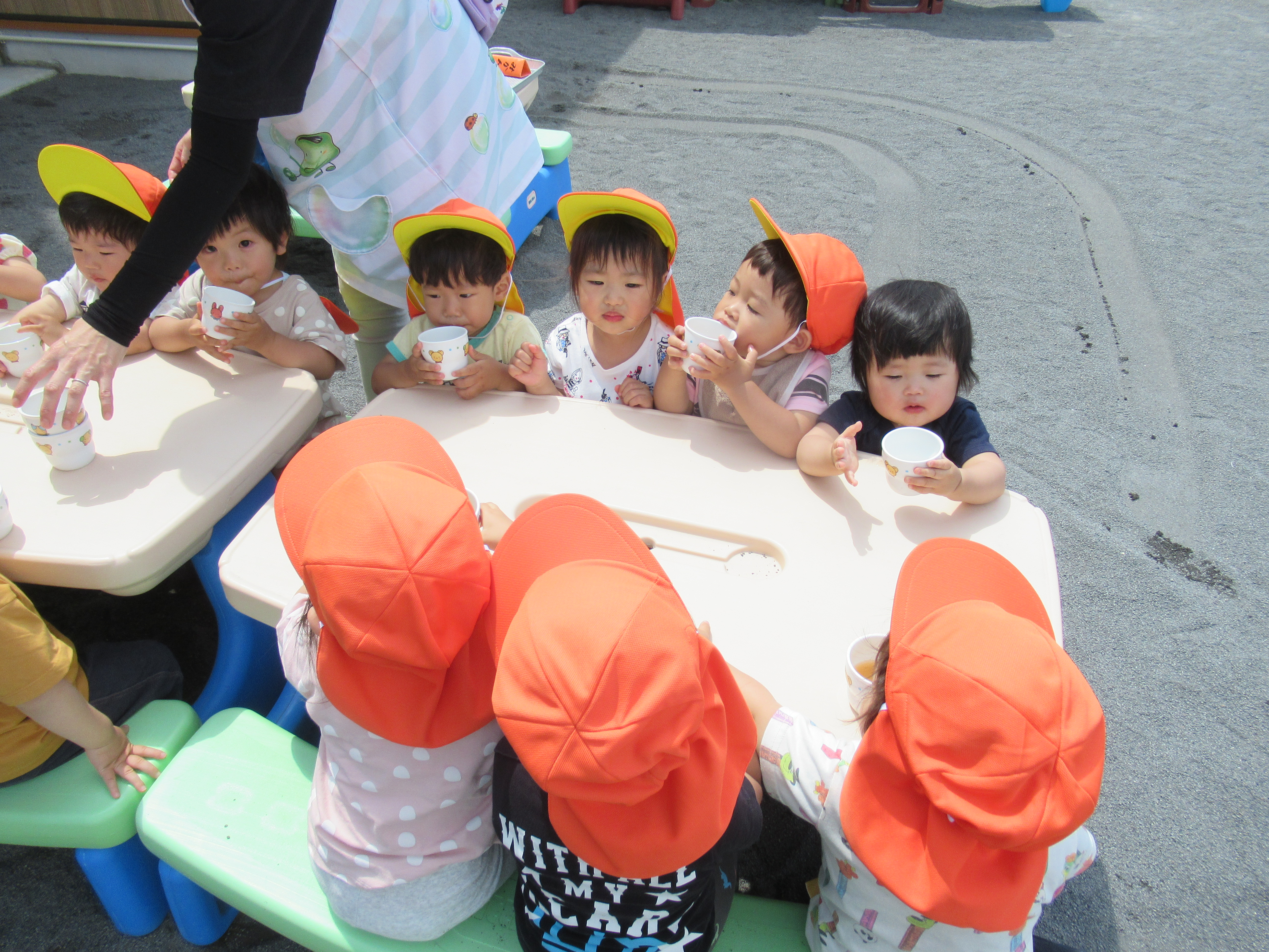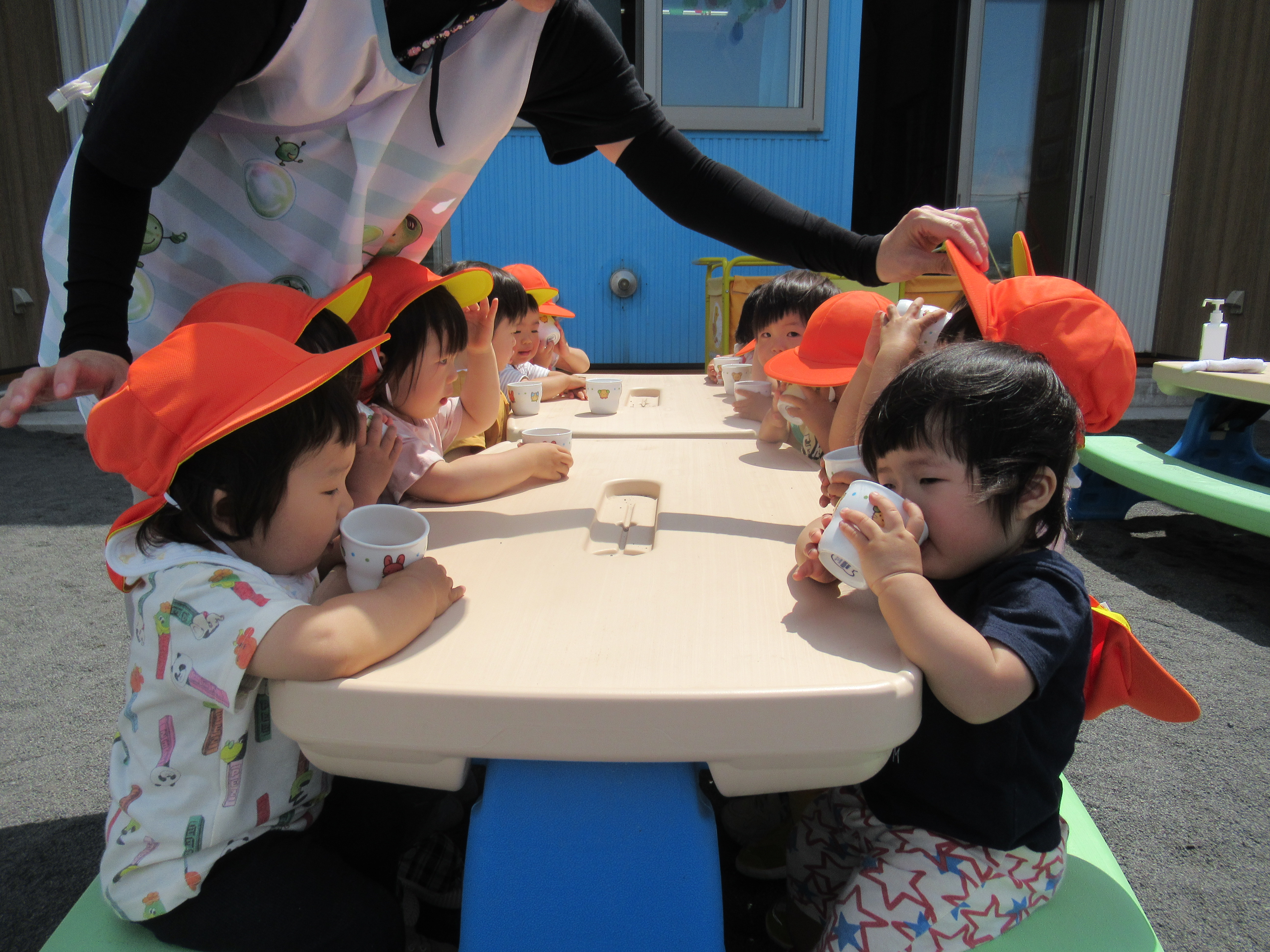 みかん組、園庭でミルクの時間。