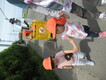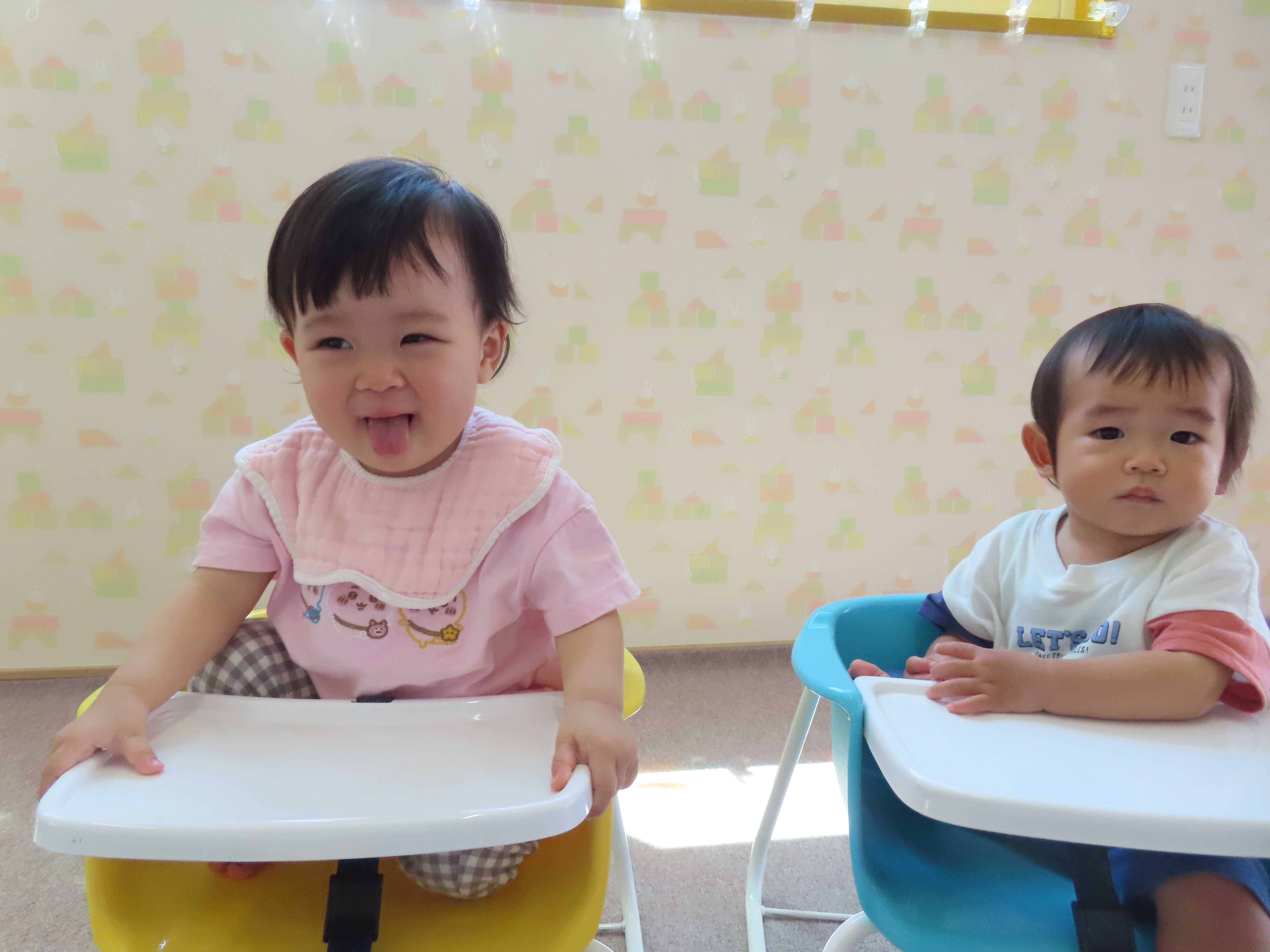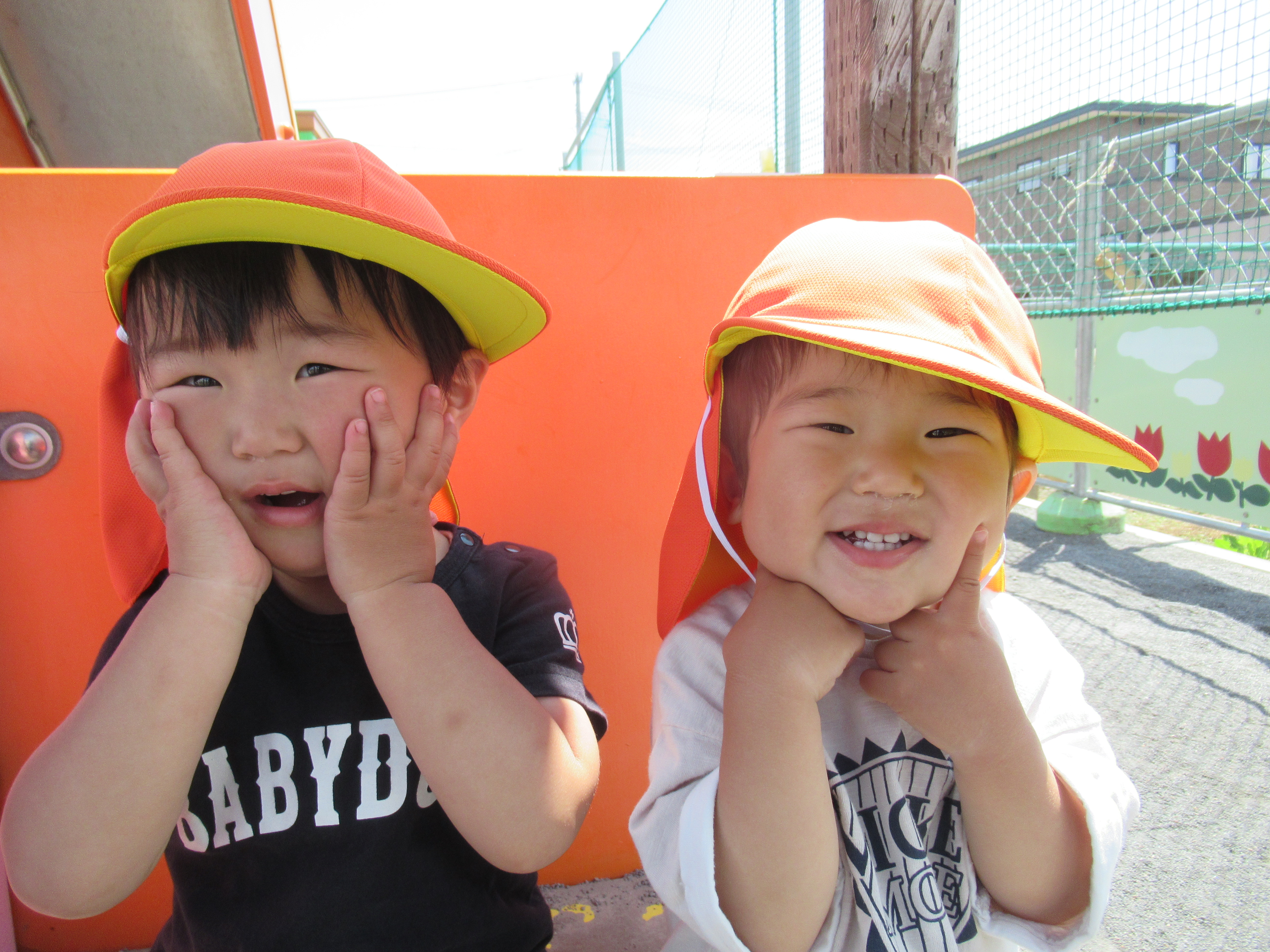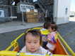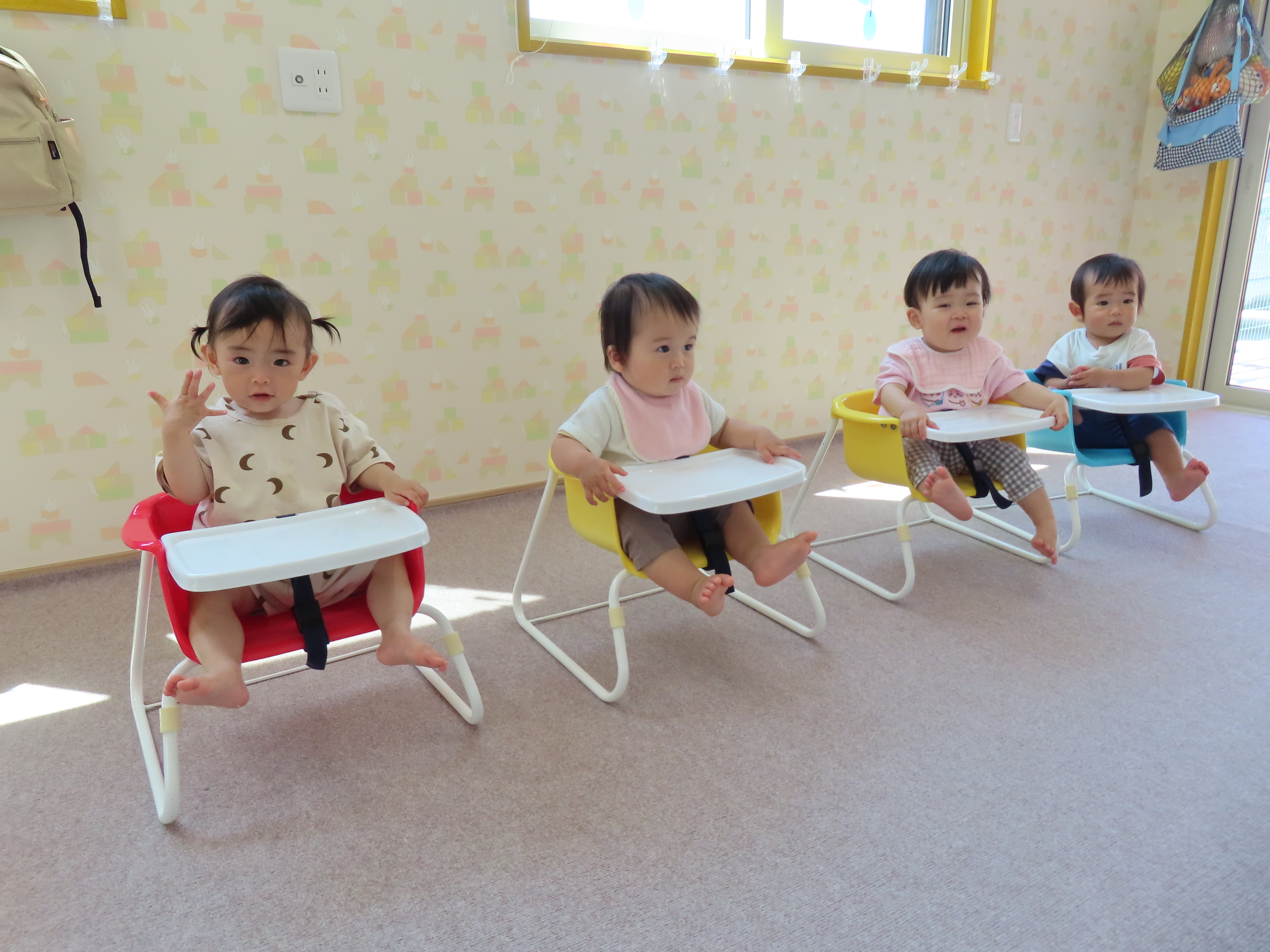 みかん組、園庭でミルクの時間。