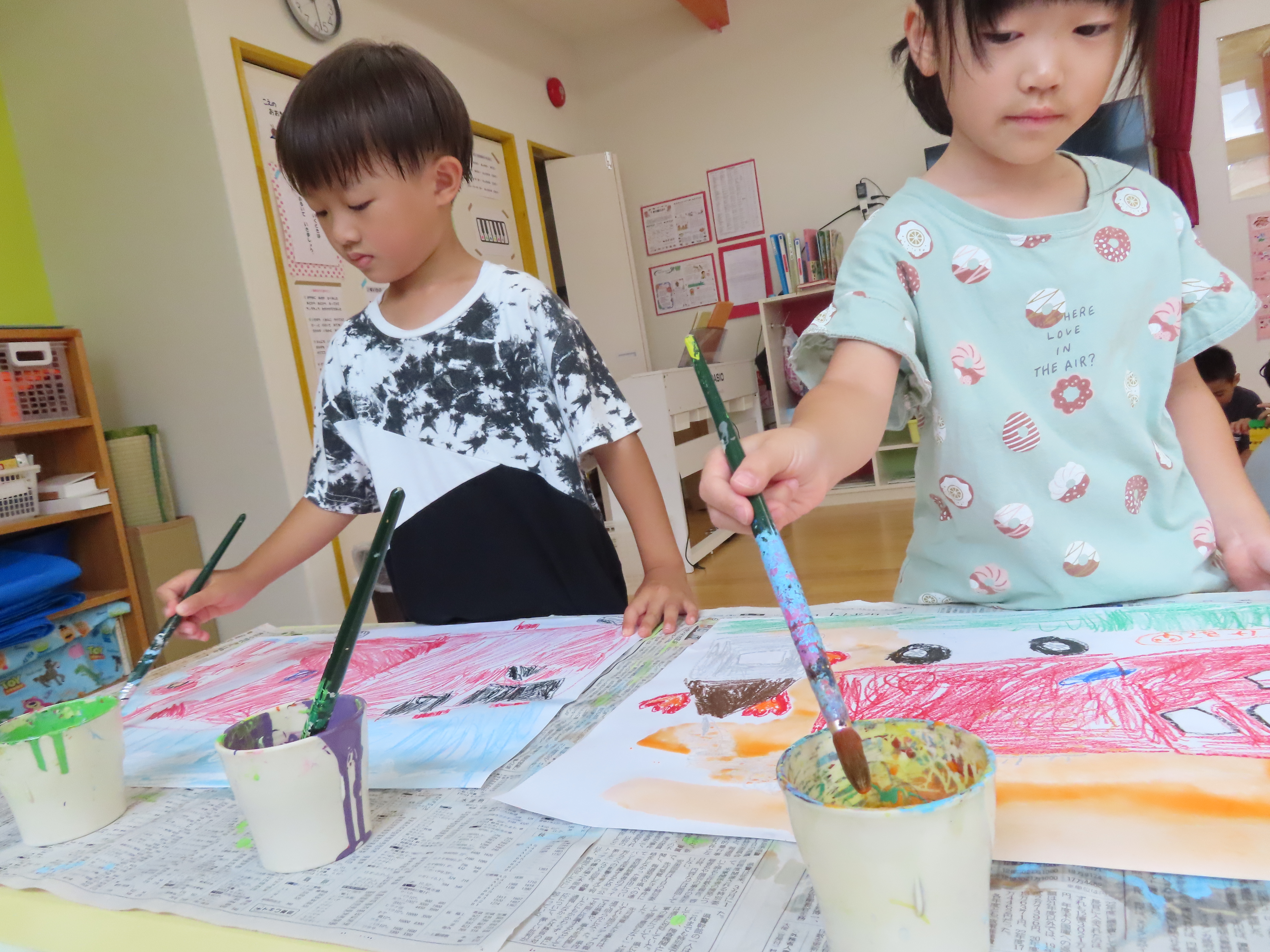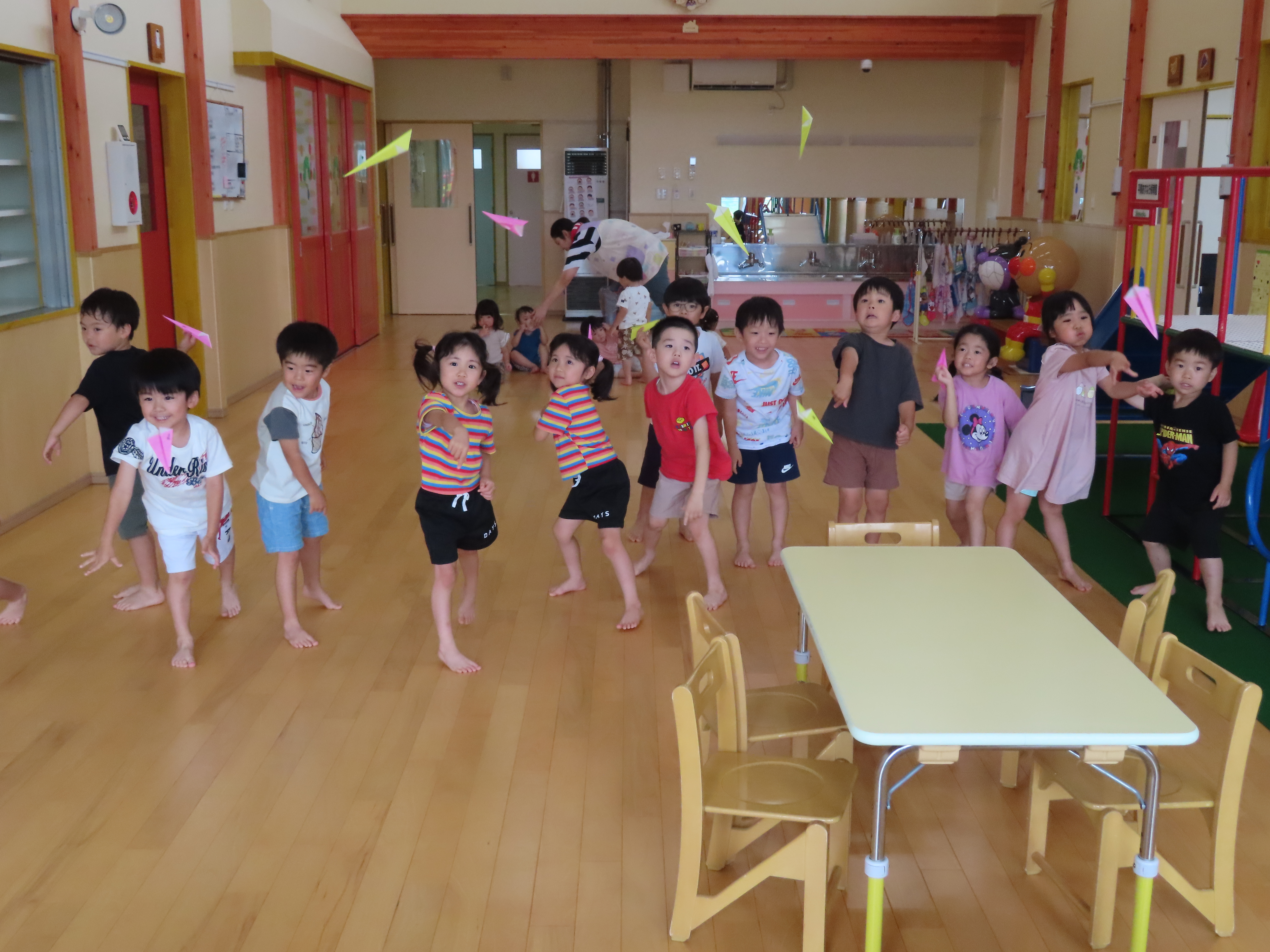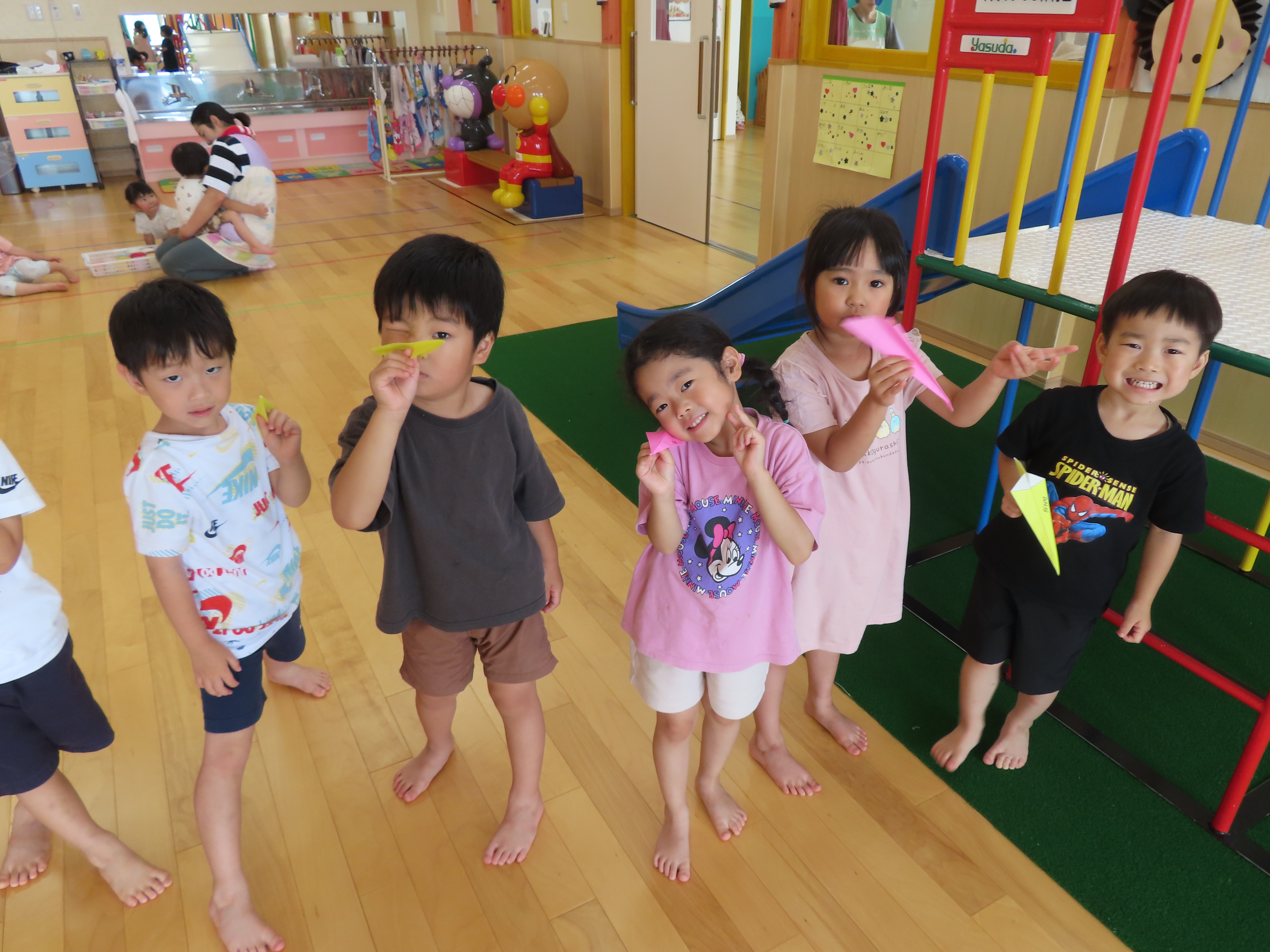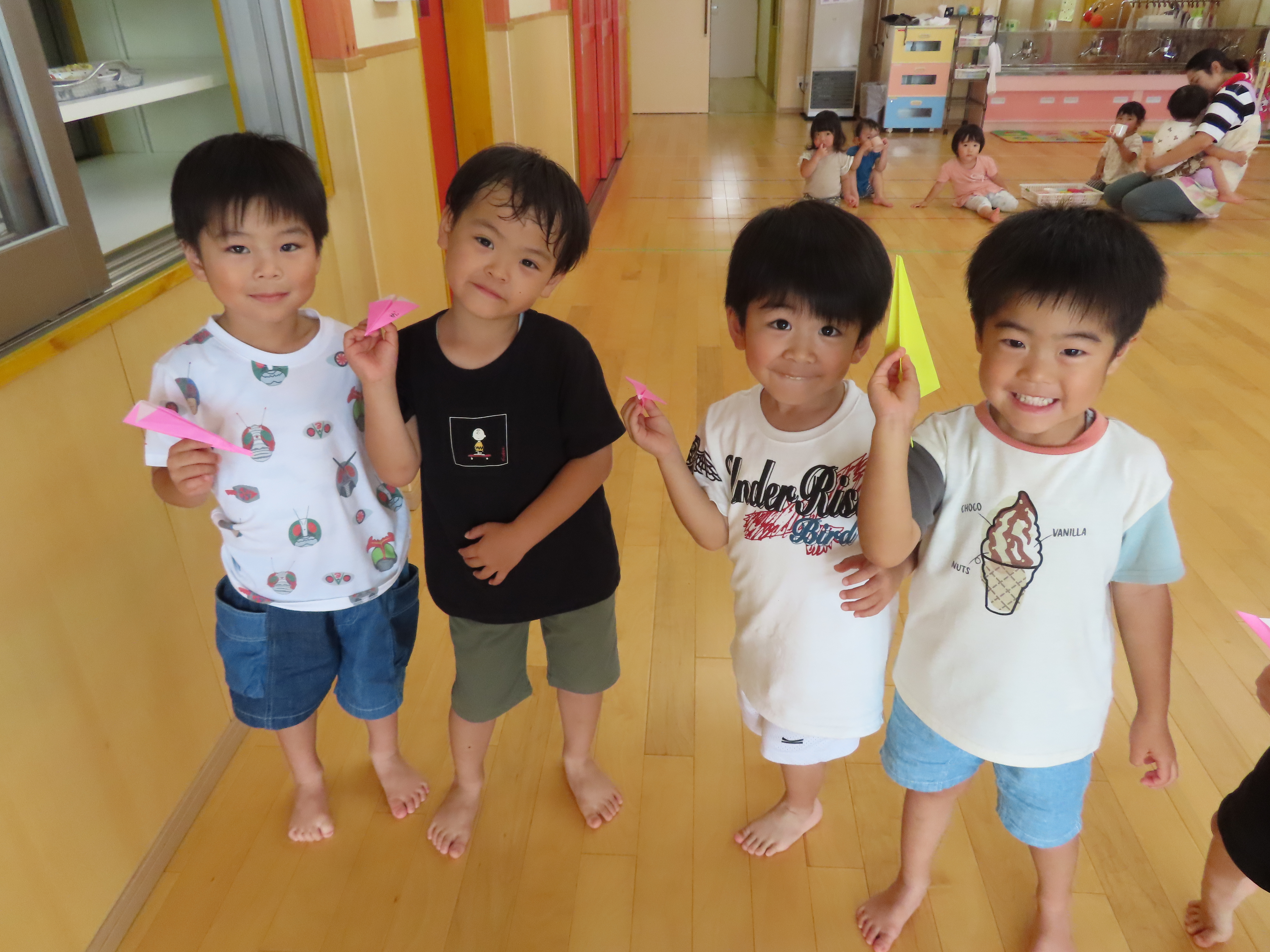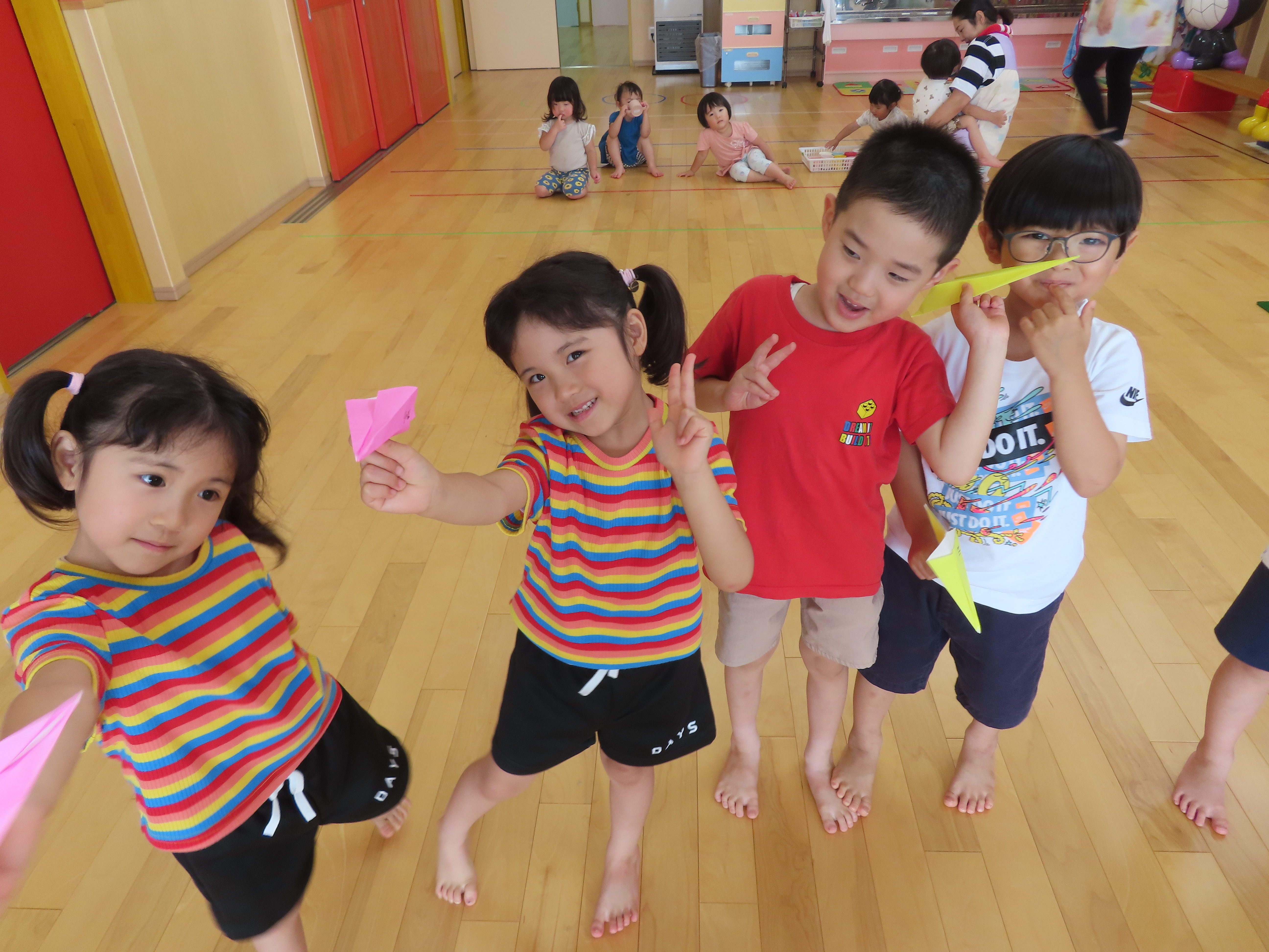 ぶどう組、自分で折った紙飛行機を飛ばそう!