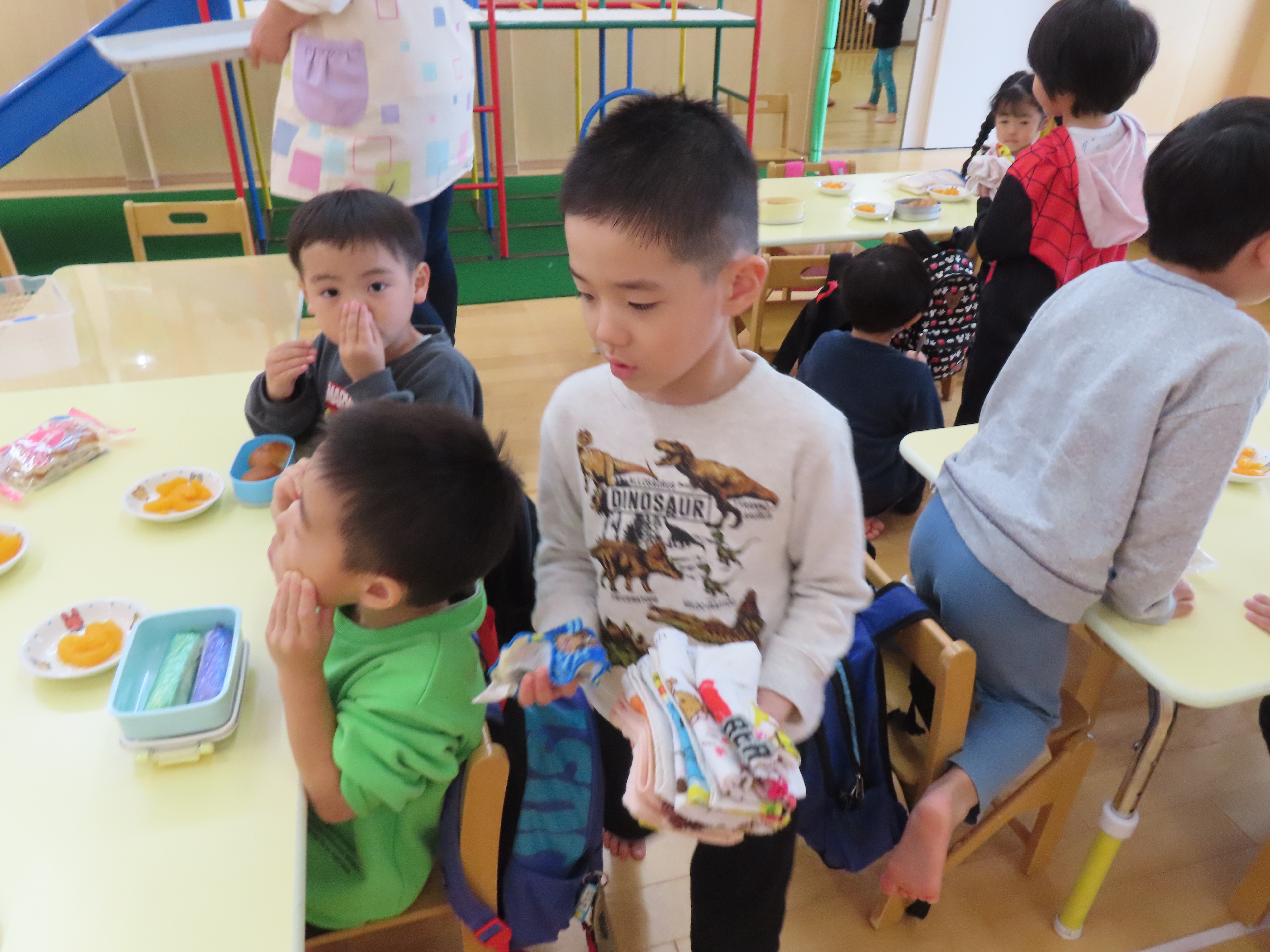 ぶどう組、お当番さんが給食のおしぼりを渡します。