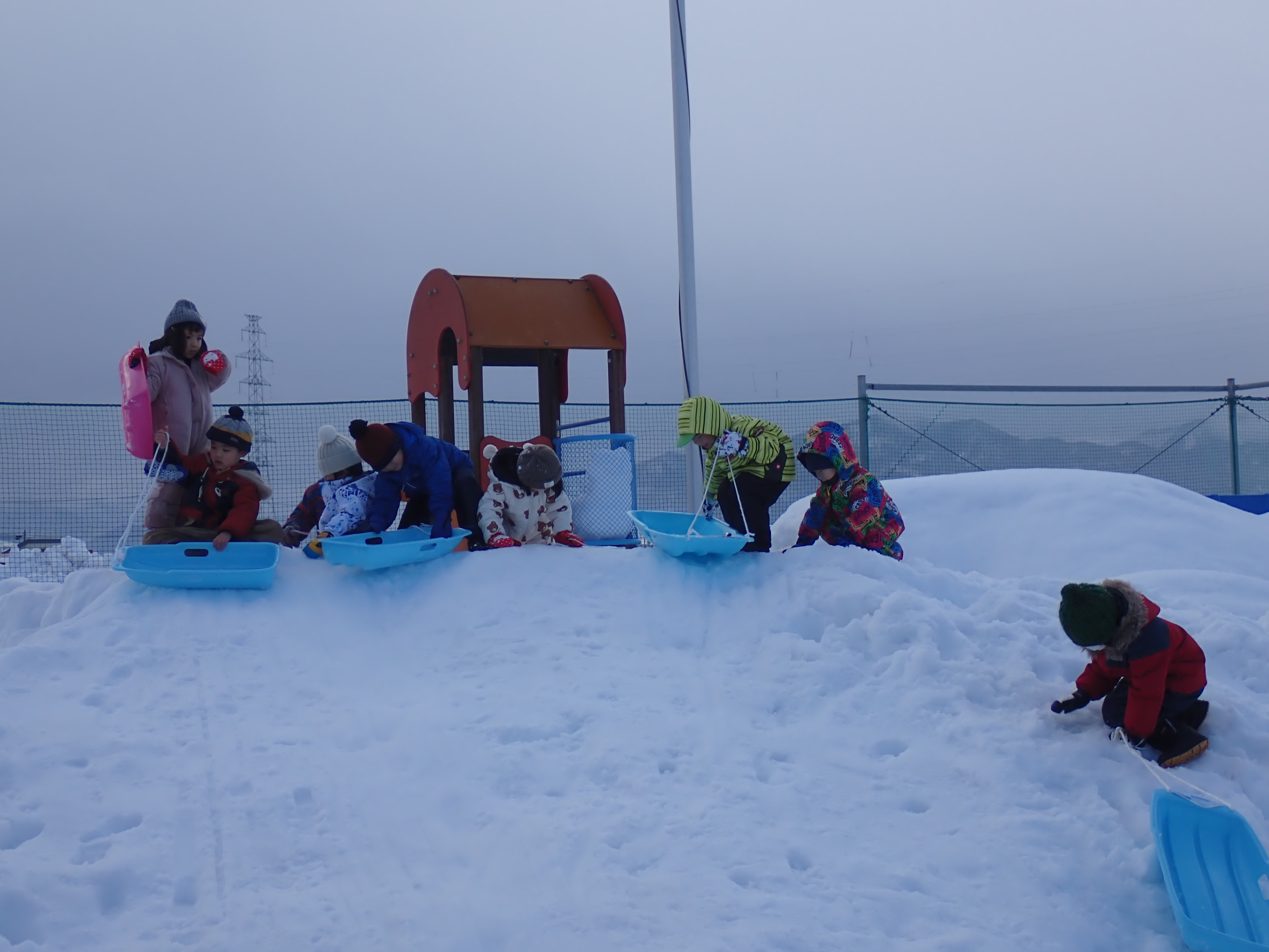 園庭の雪山で雪遊び!