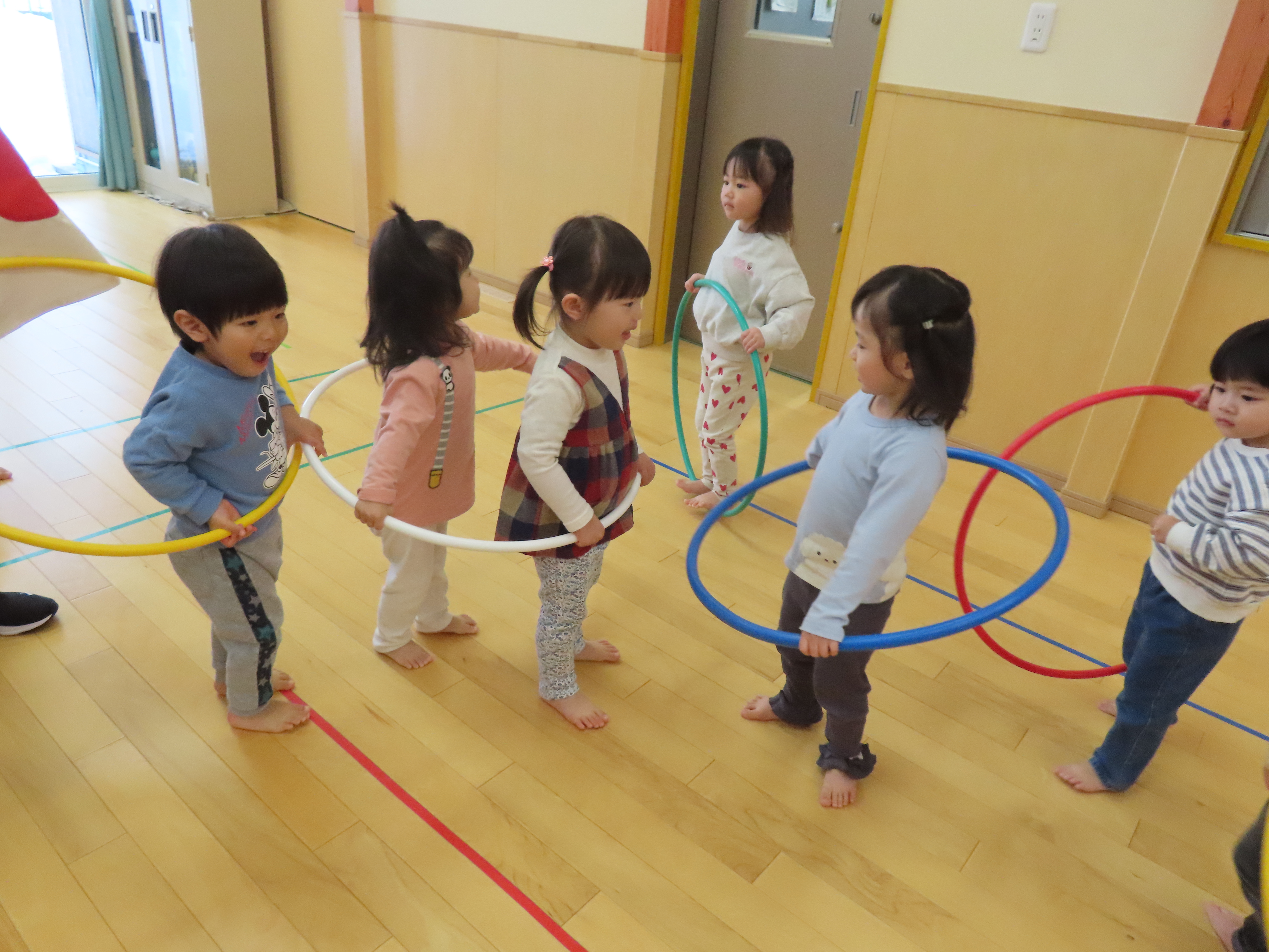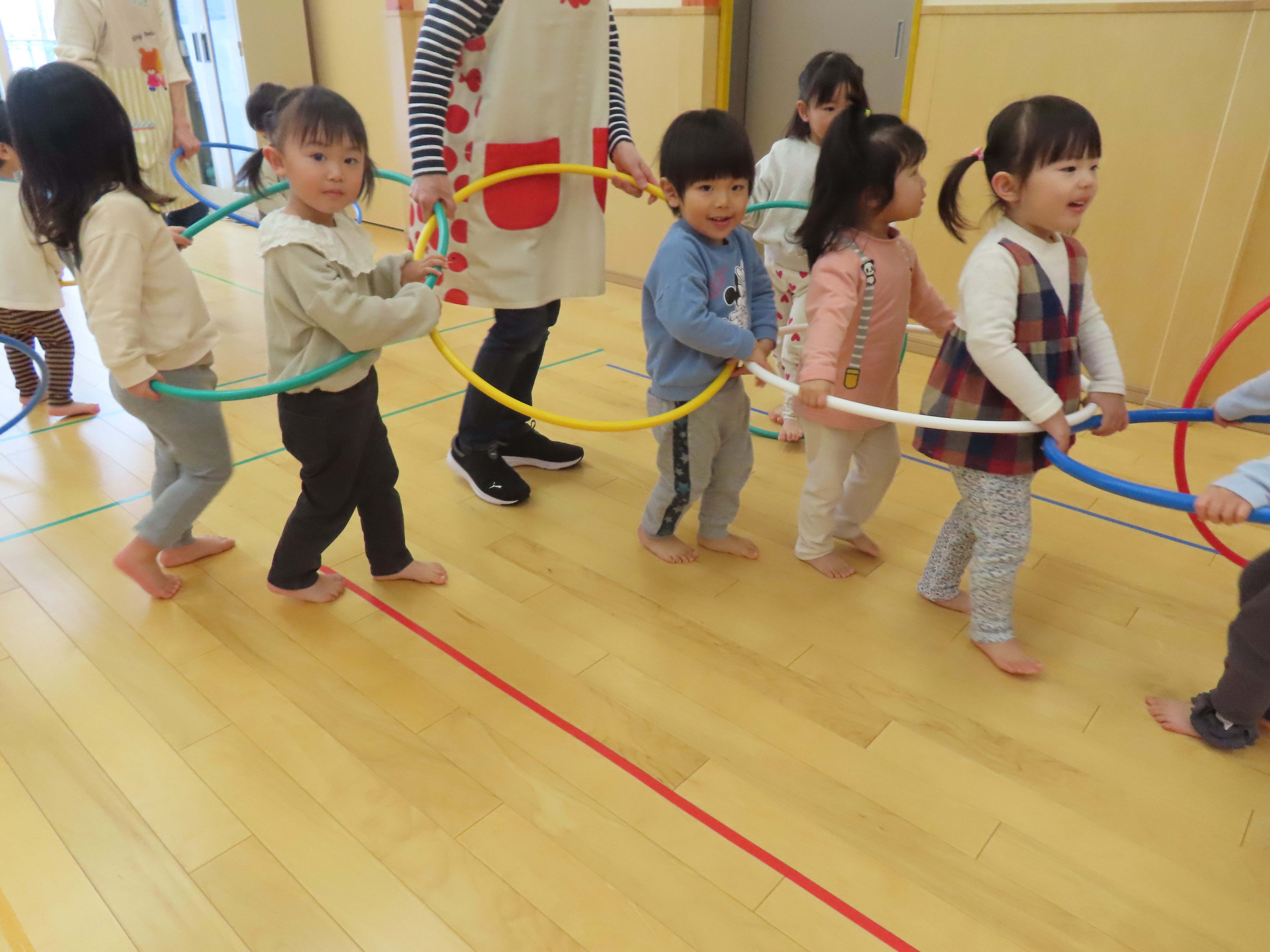 フラフープで電車ごっこ。
