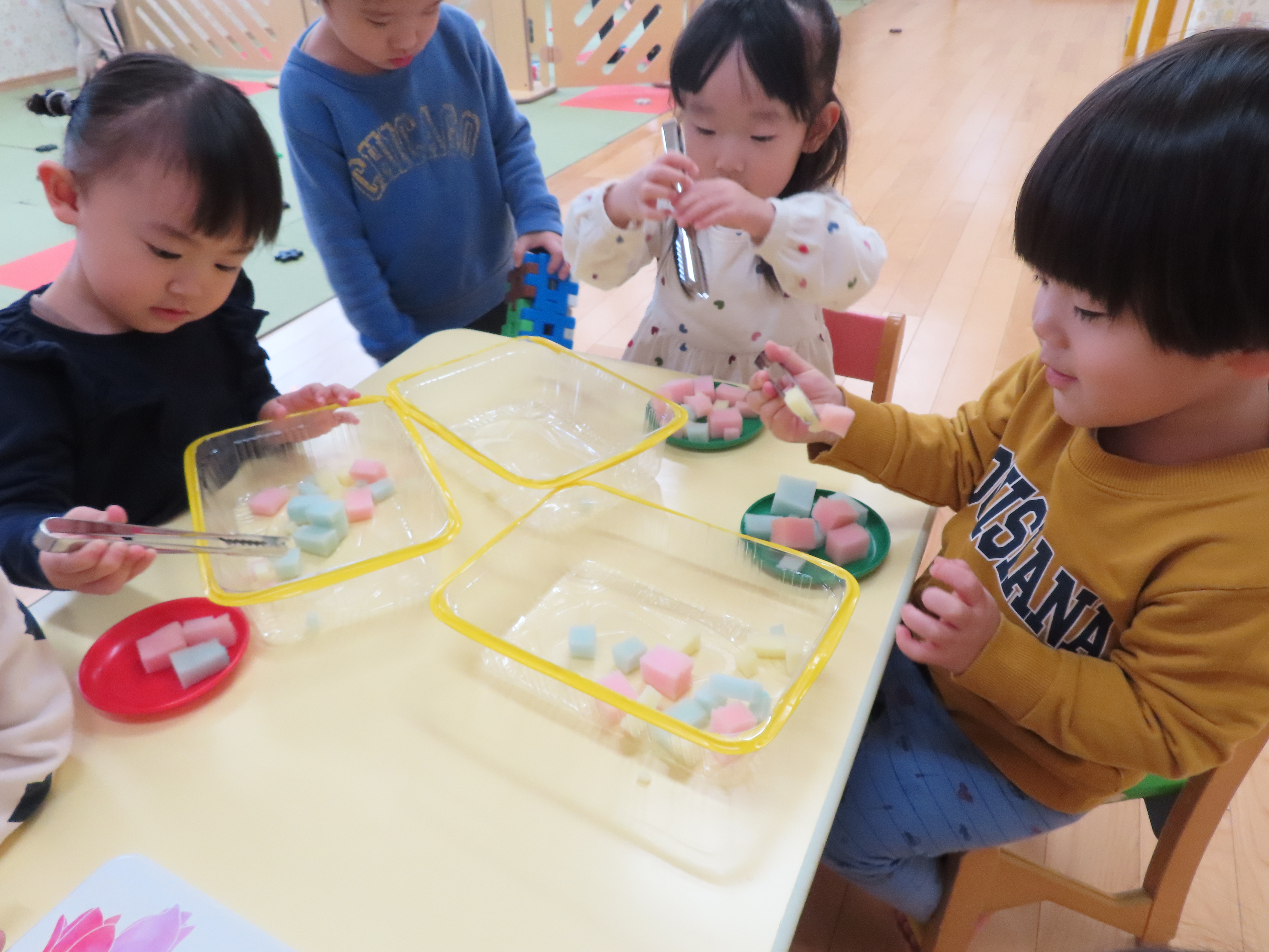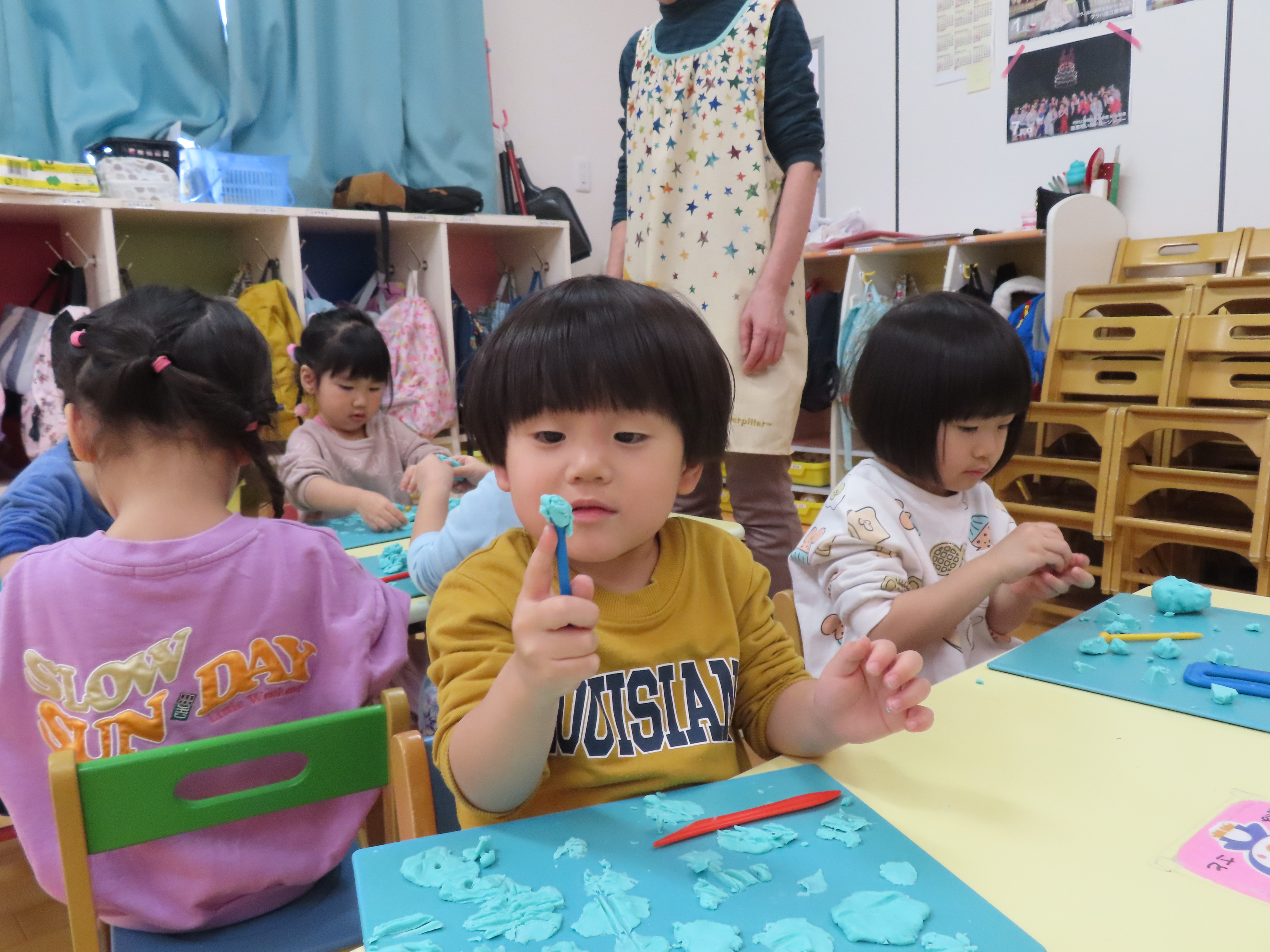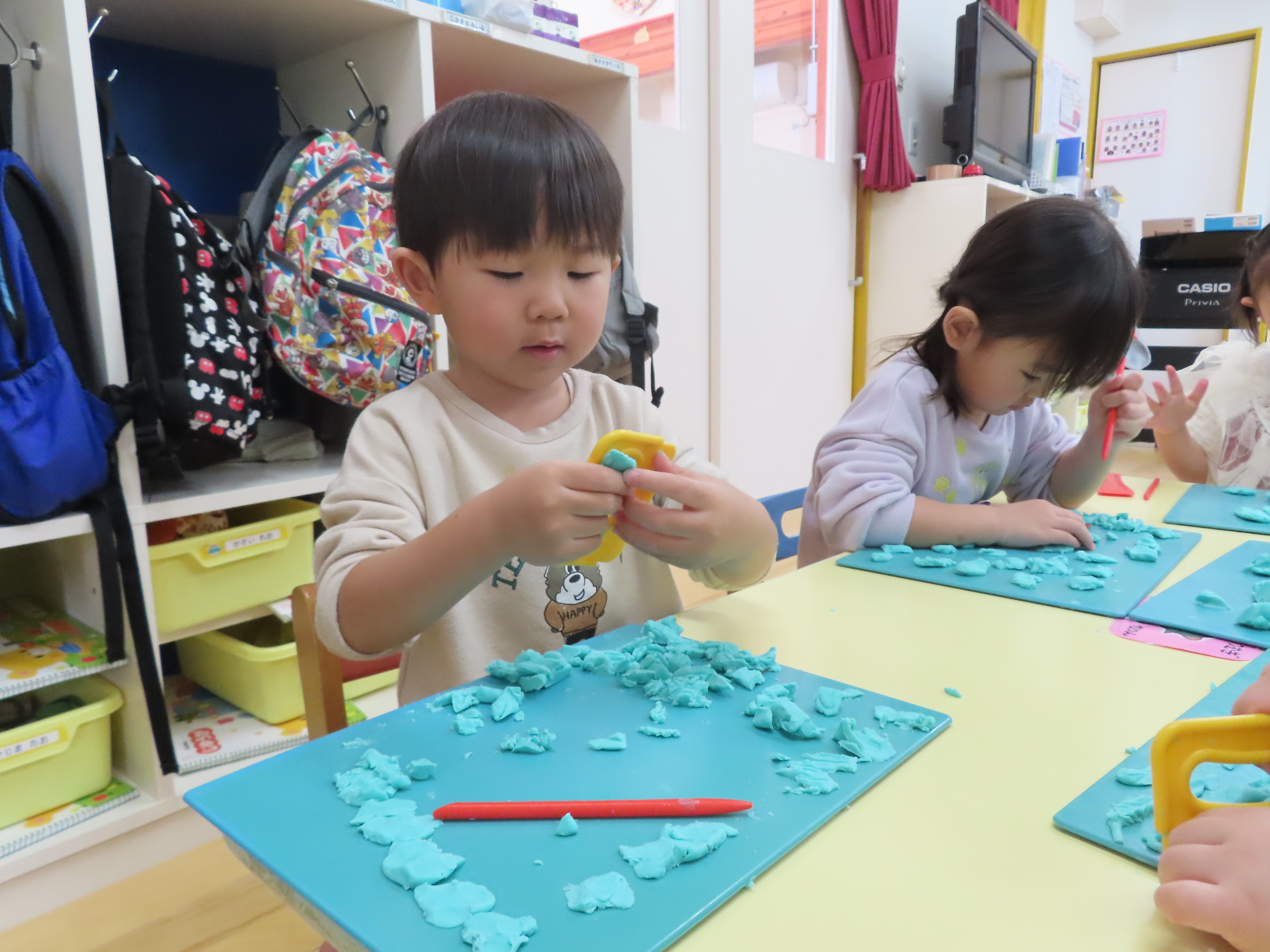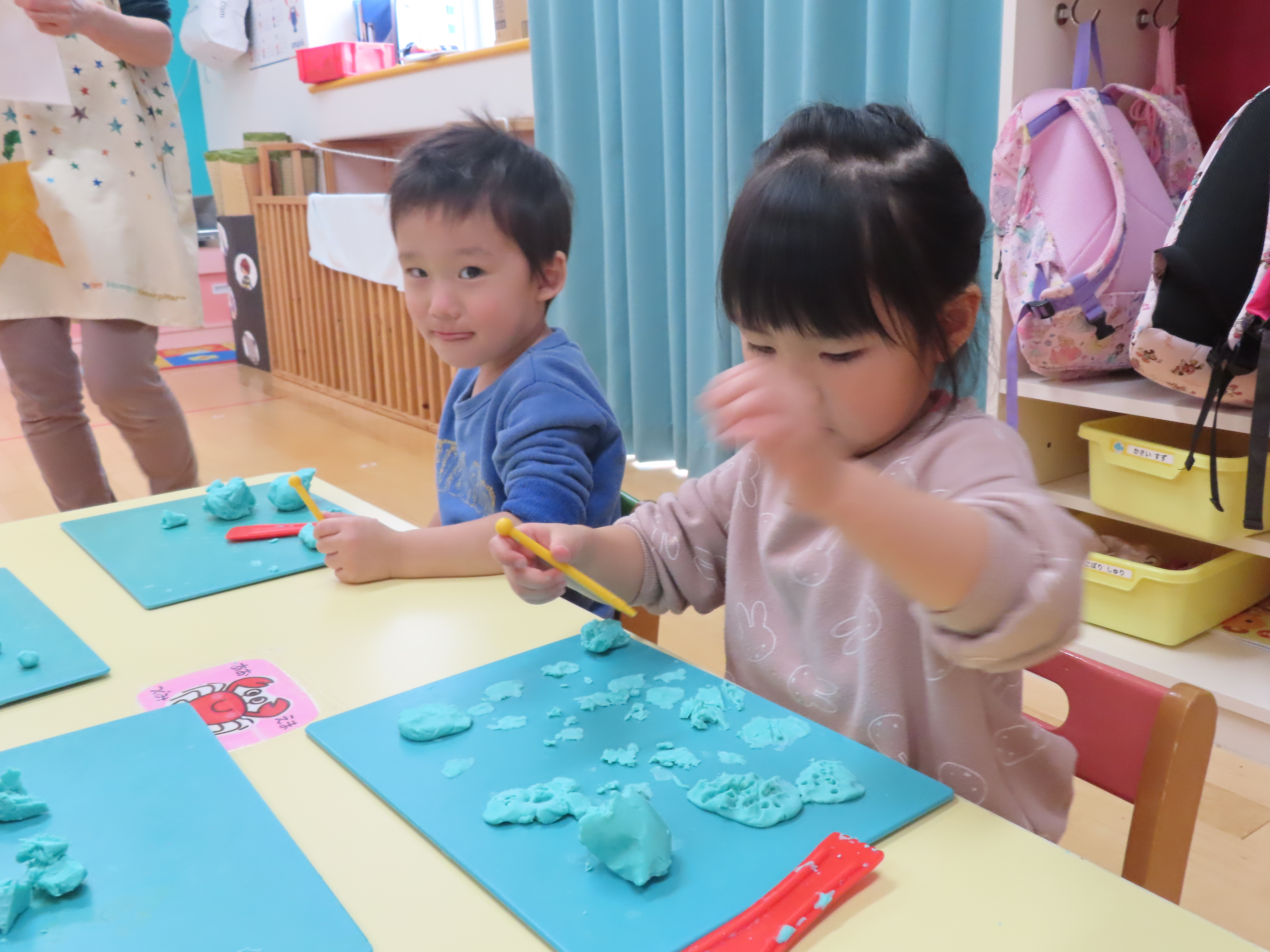 粘土遊び。ちぎって丸めて感触を楽しみました。
