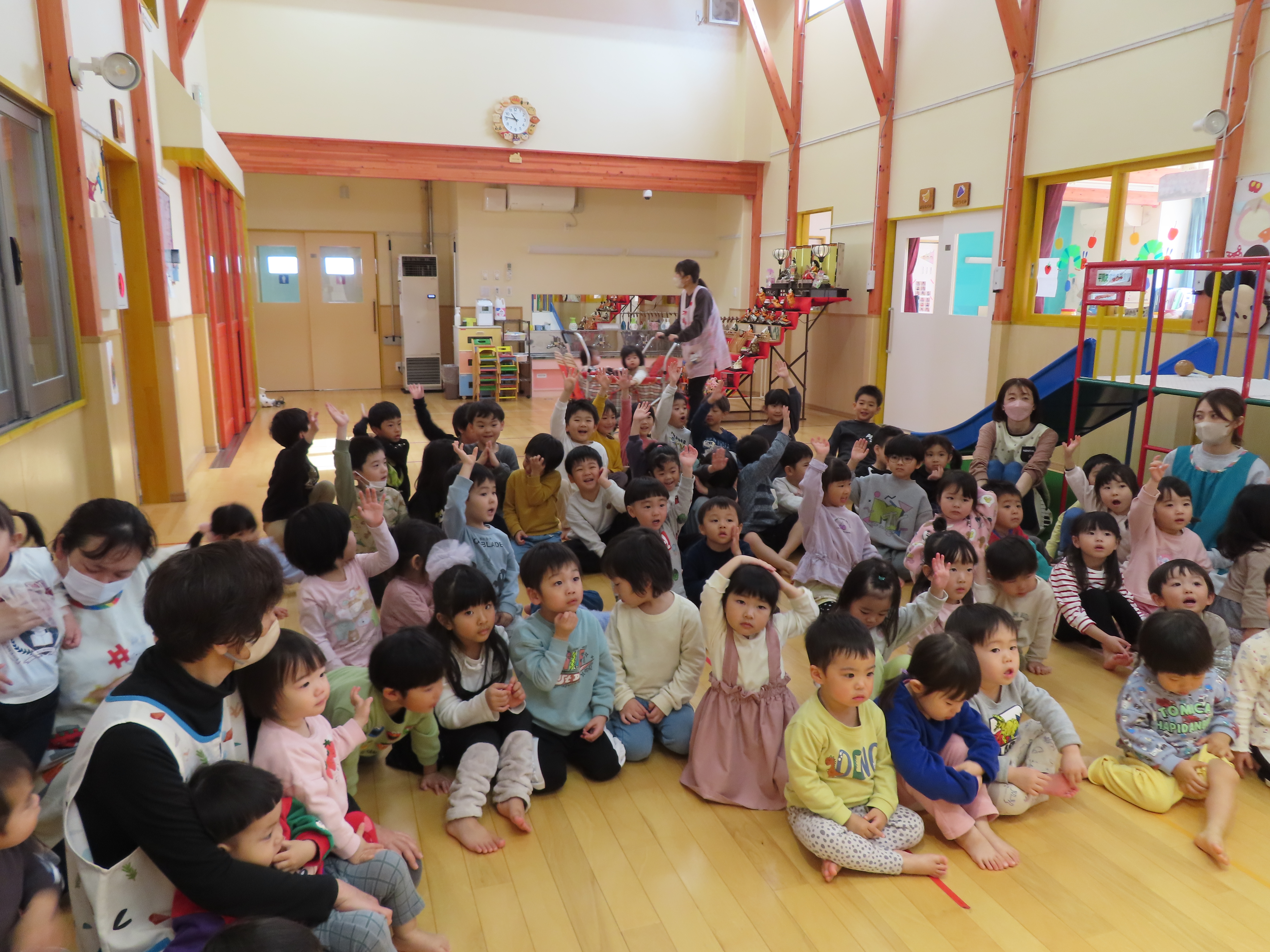 「ひな祭り」クイズ。みんな興味津々で参加。