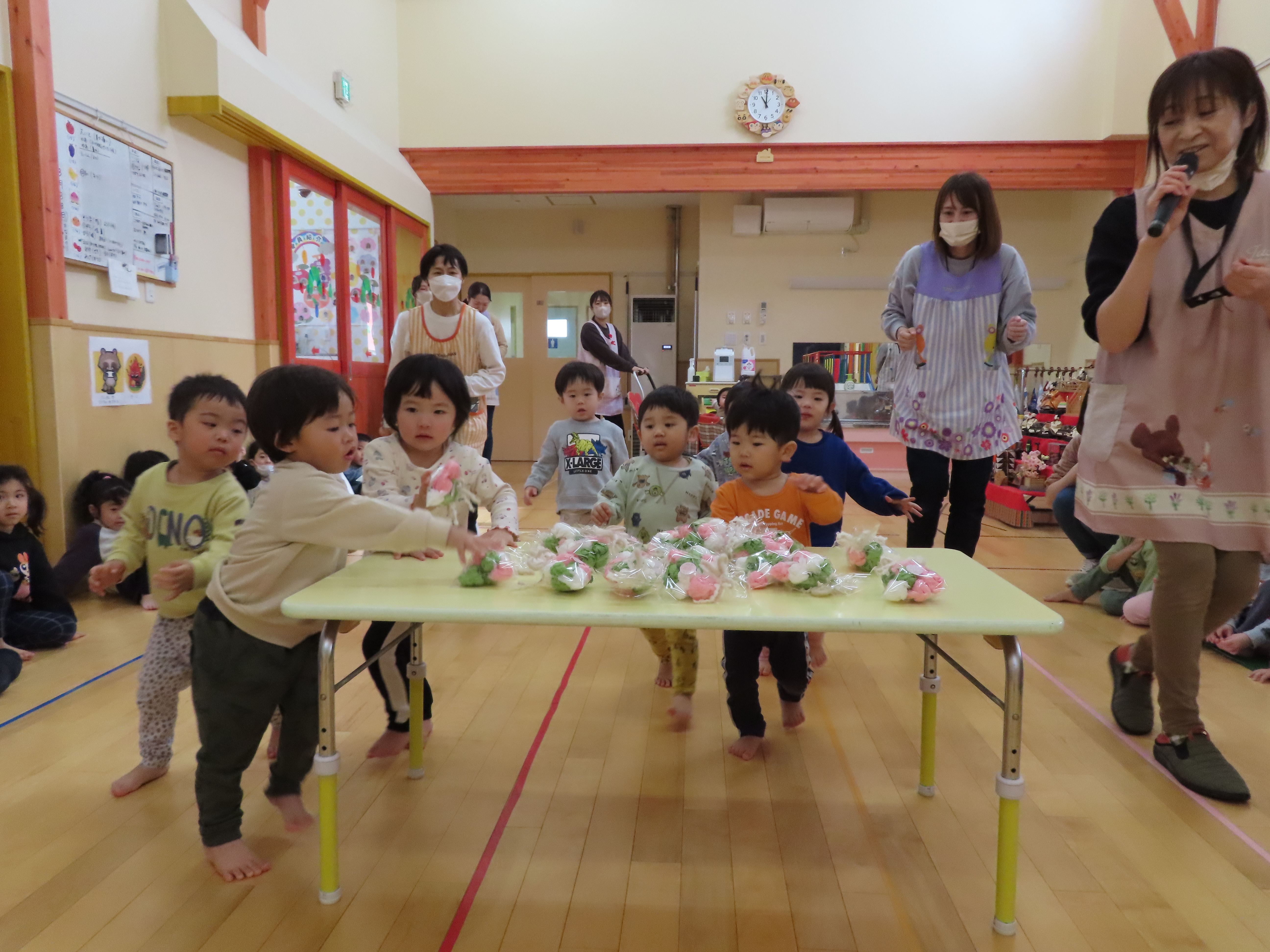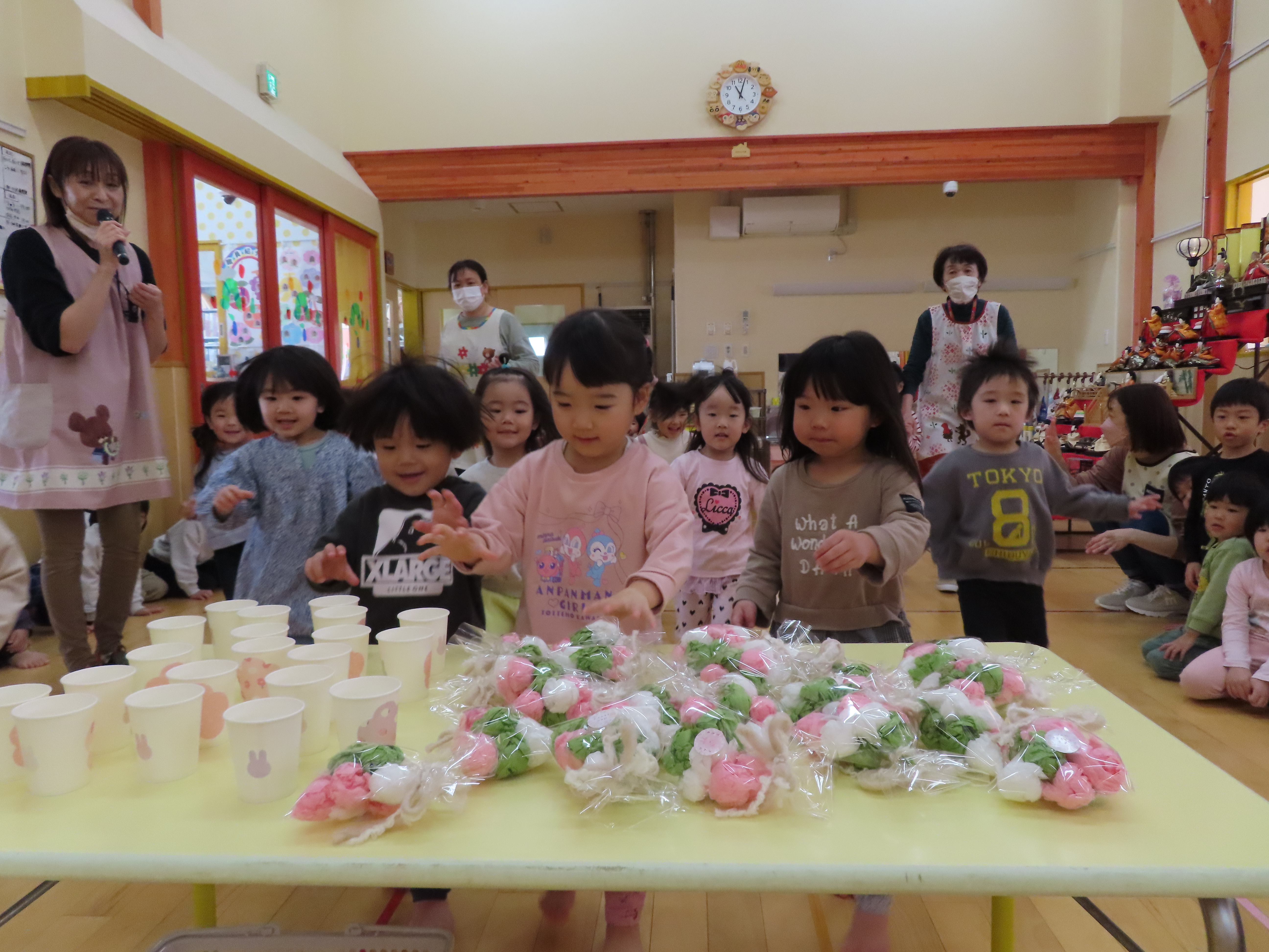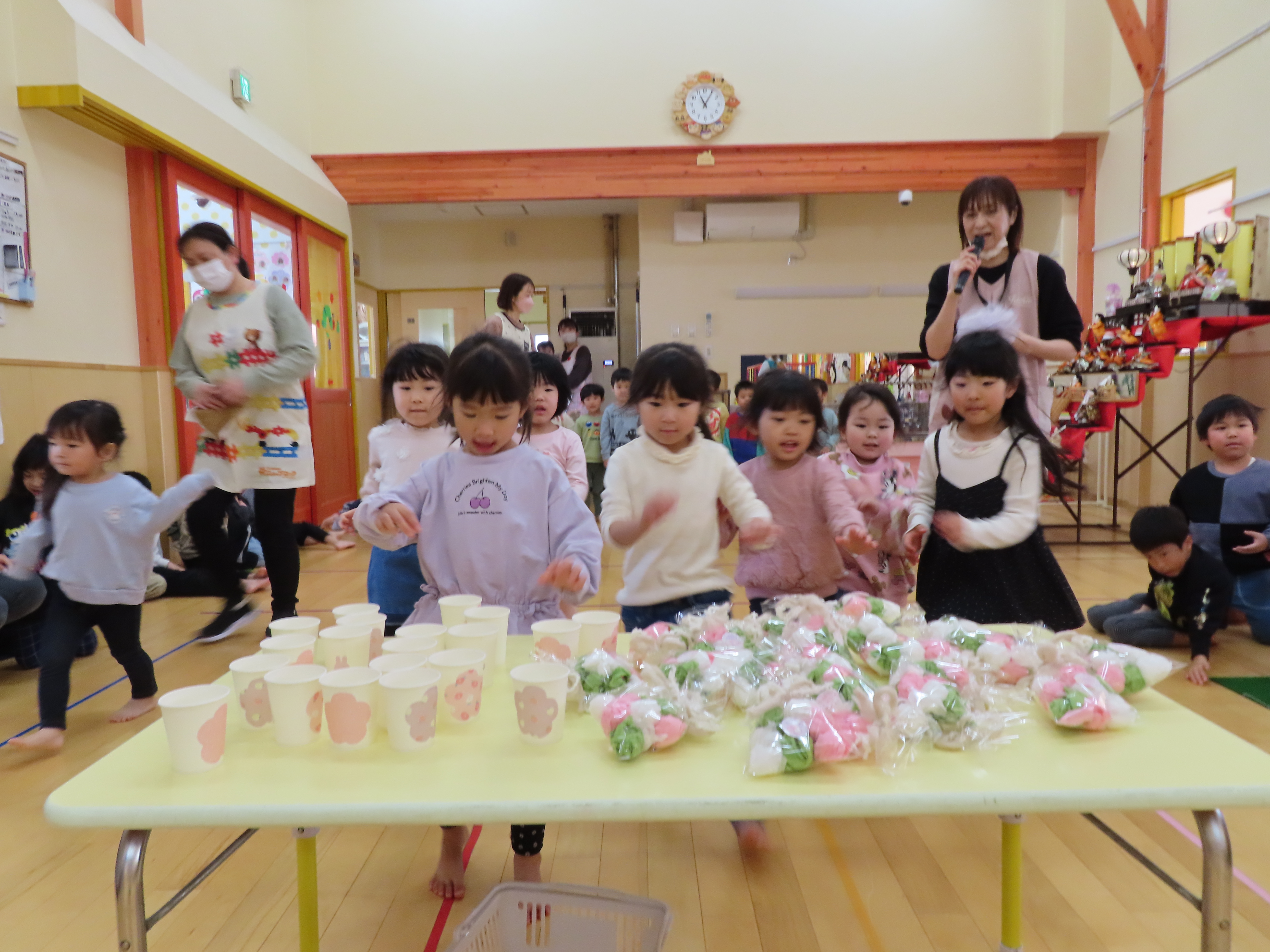「ひな祭りゲーム」みかん組はひなあられをお供えします。