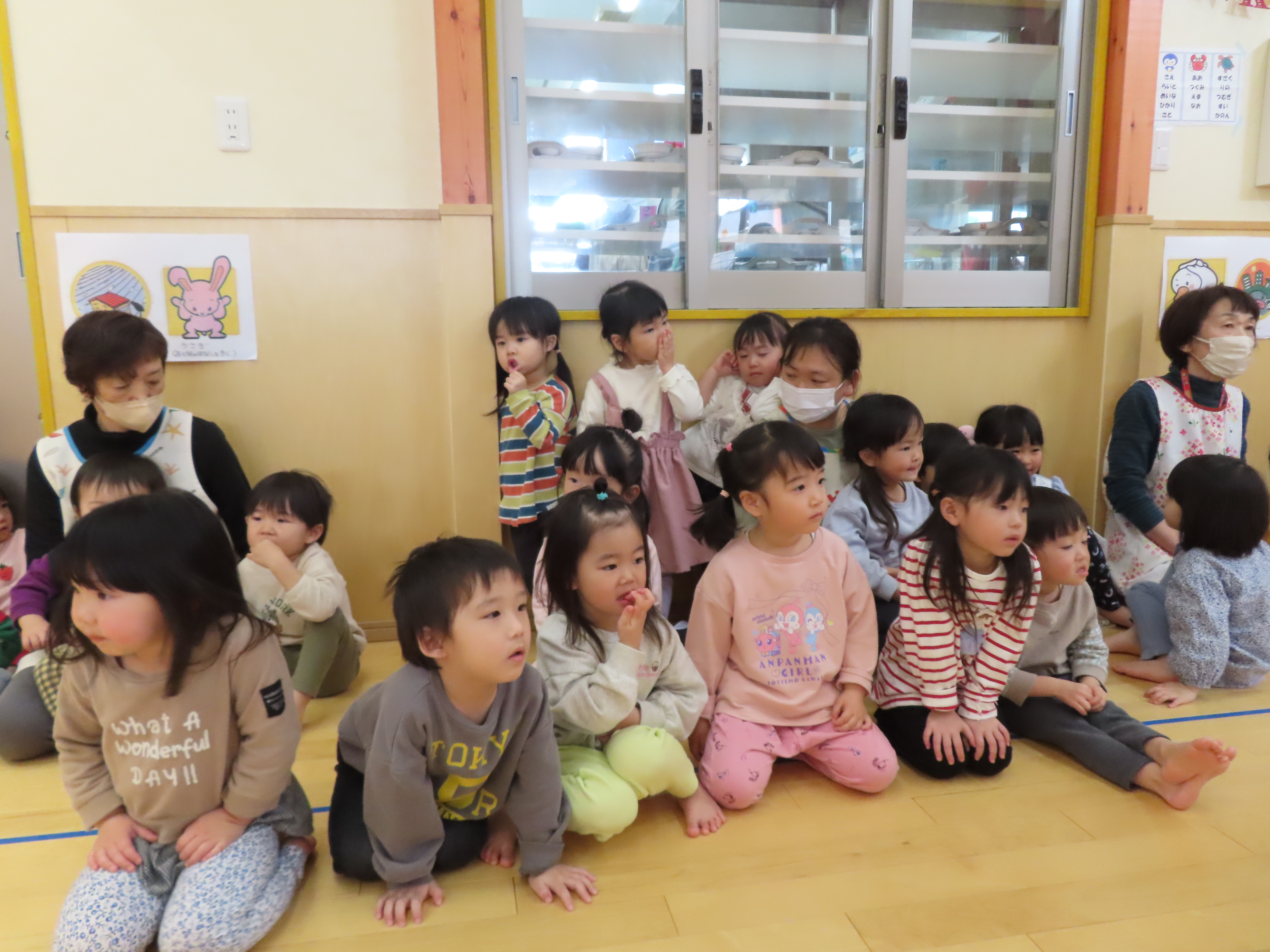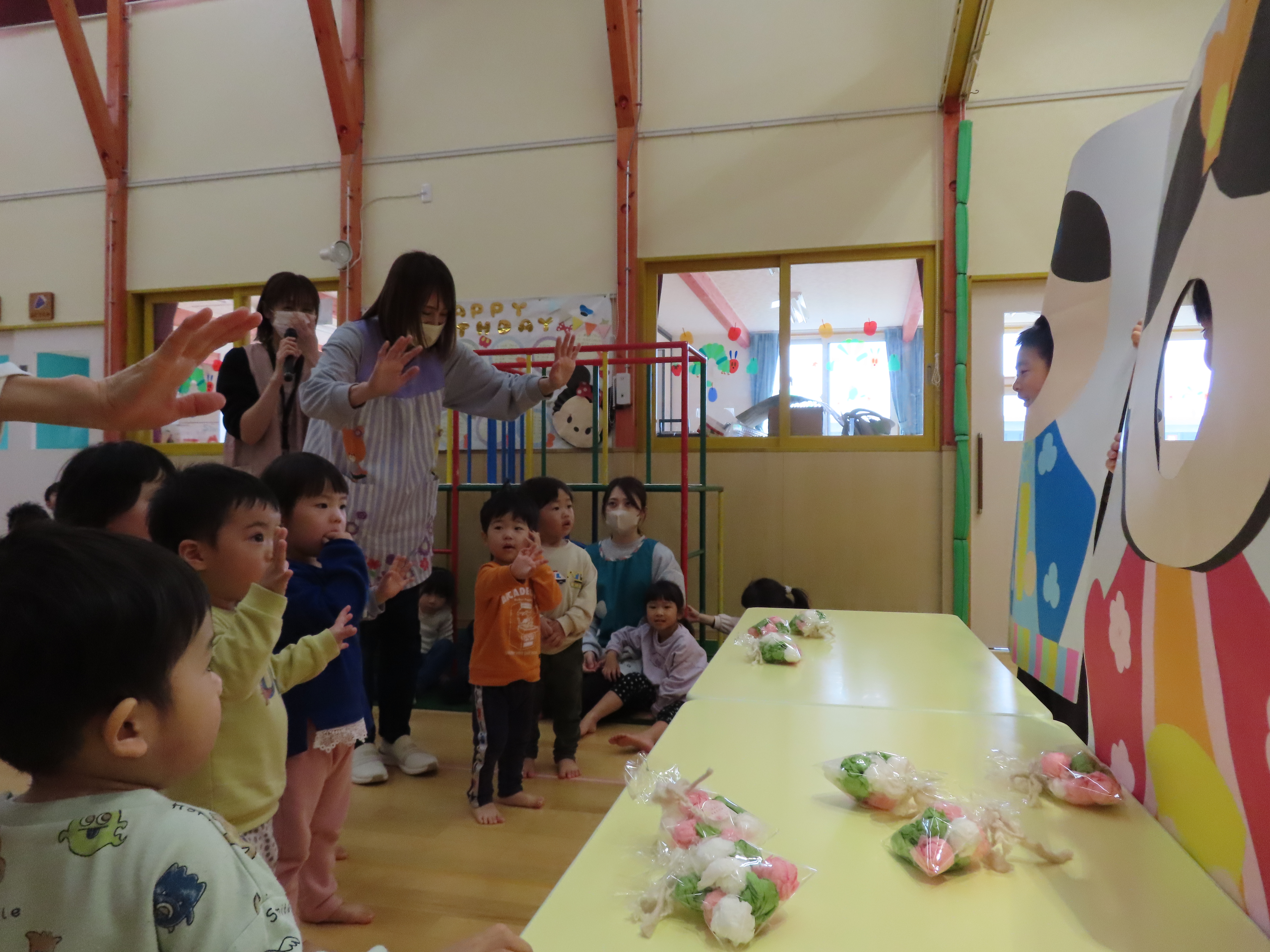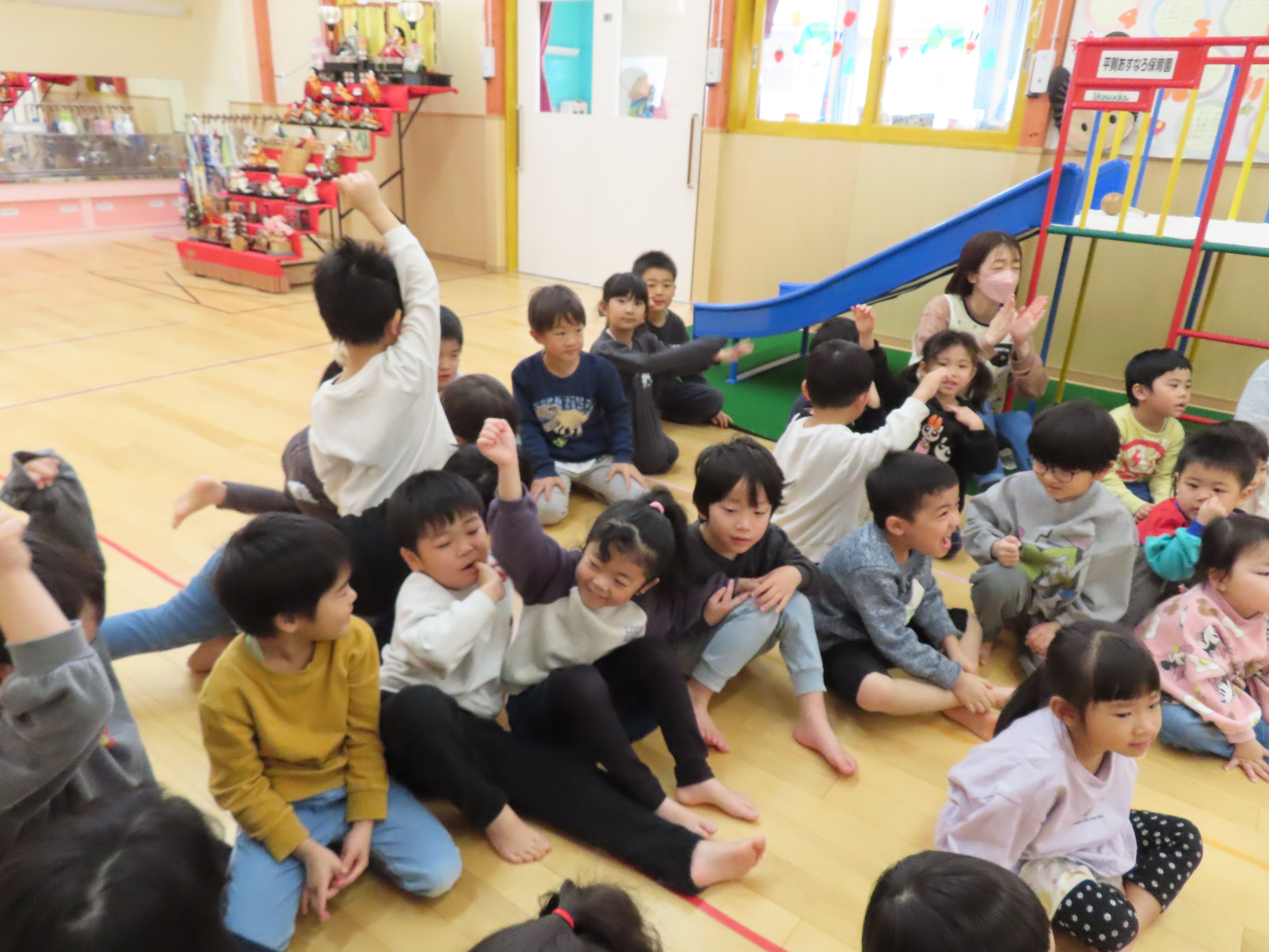 「ひな祭りゲーム」みかん組はひなあられをお供えします。