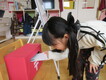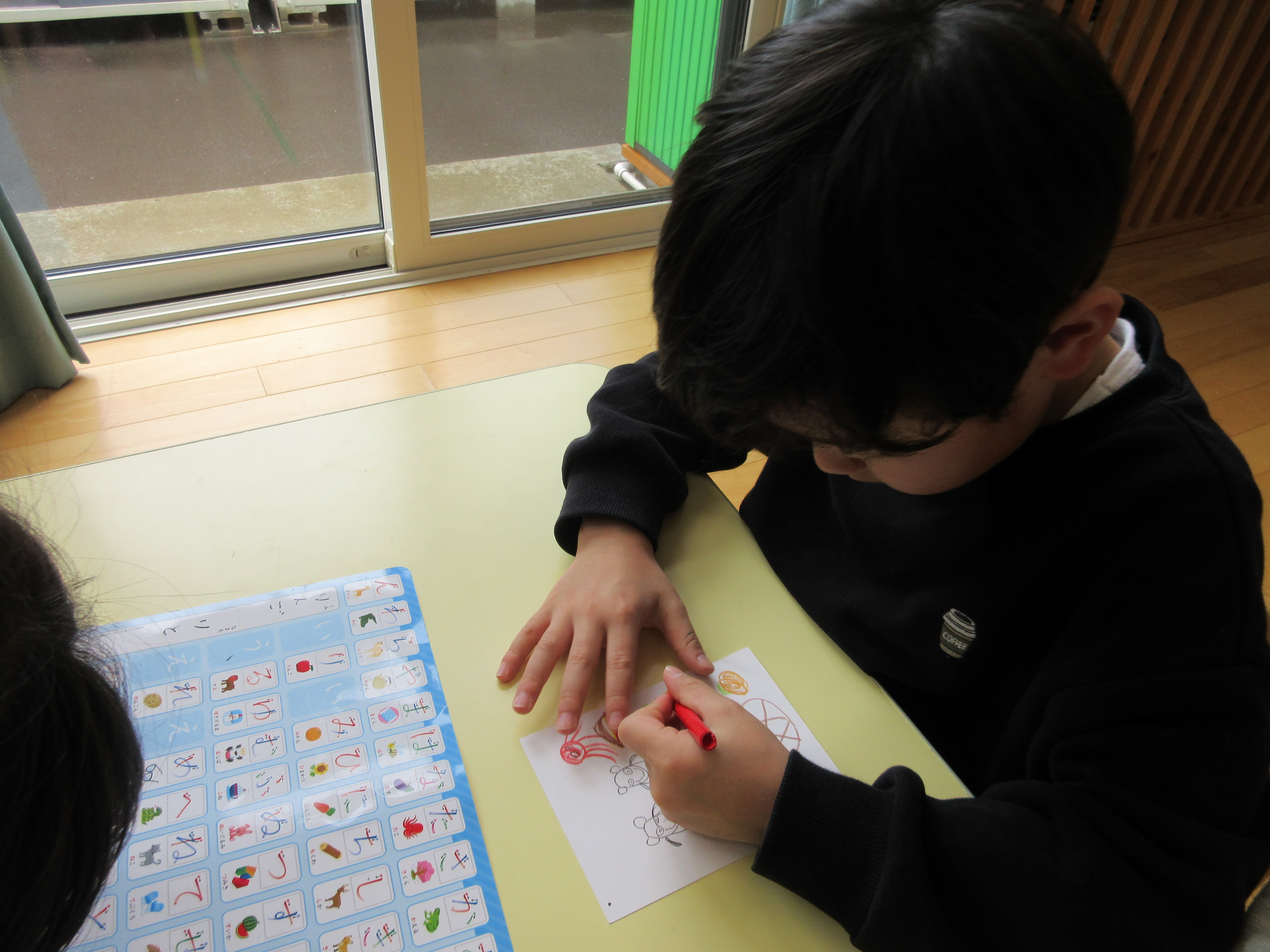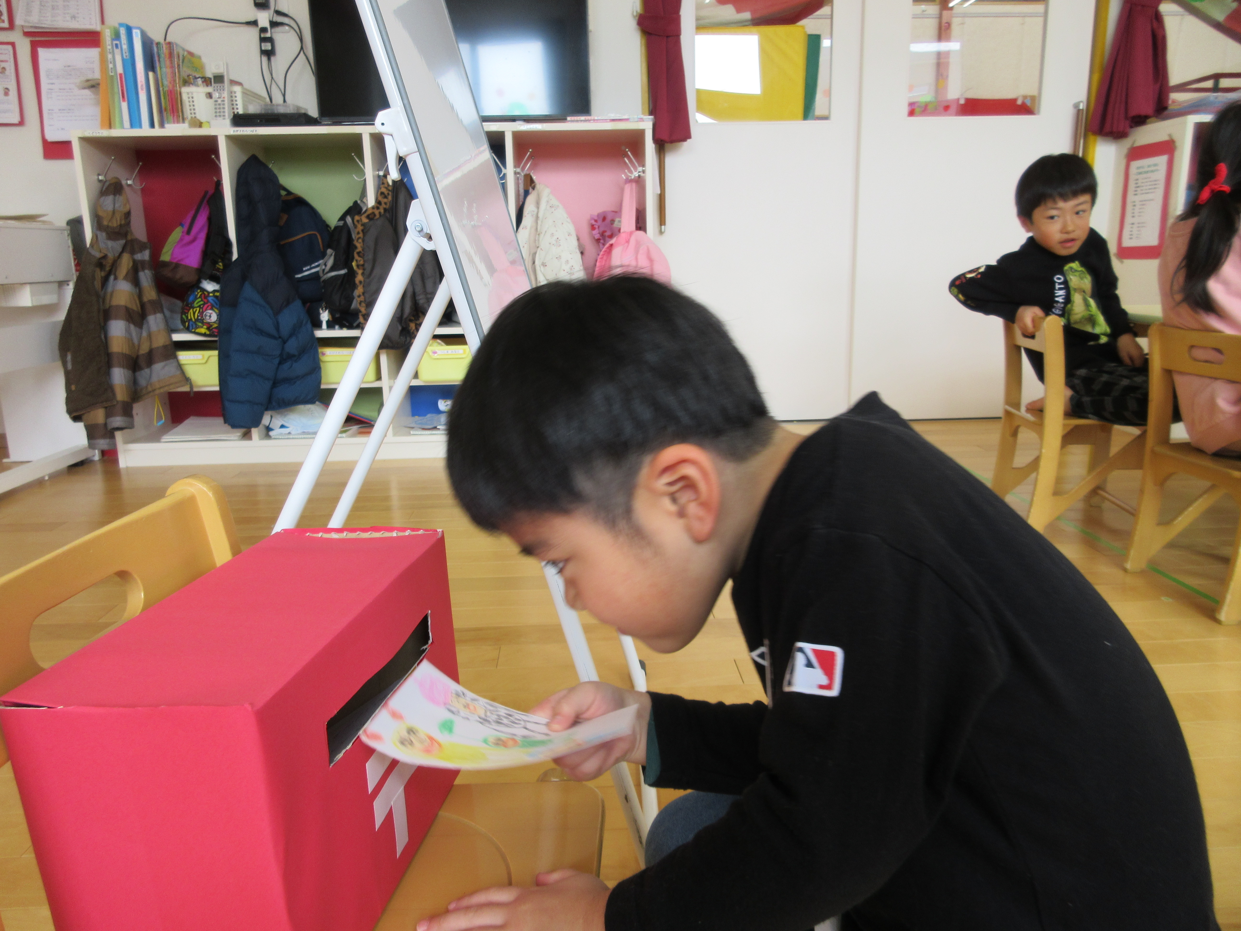 お手紙ごっこ。覚えたてのひらがなを書いてポストへ 投函。