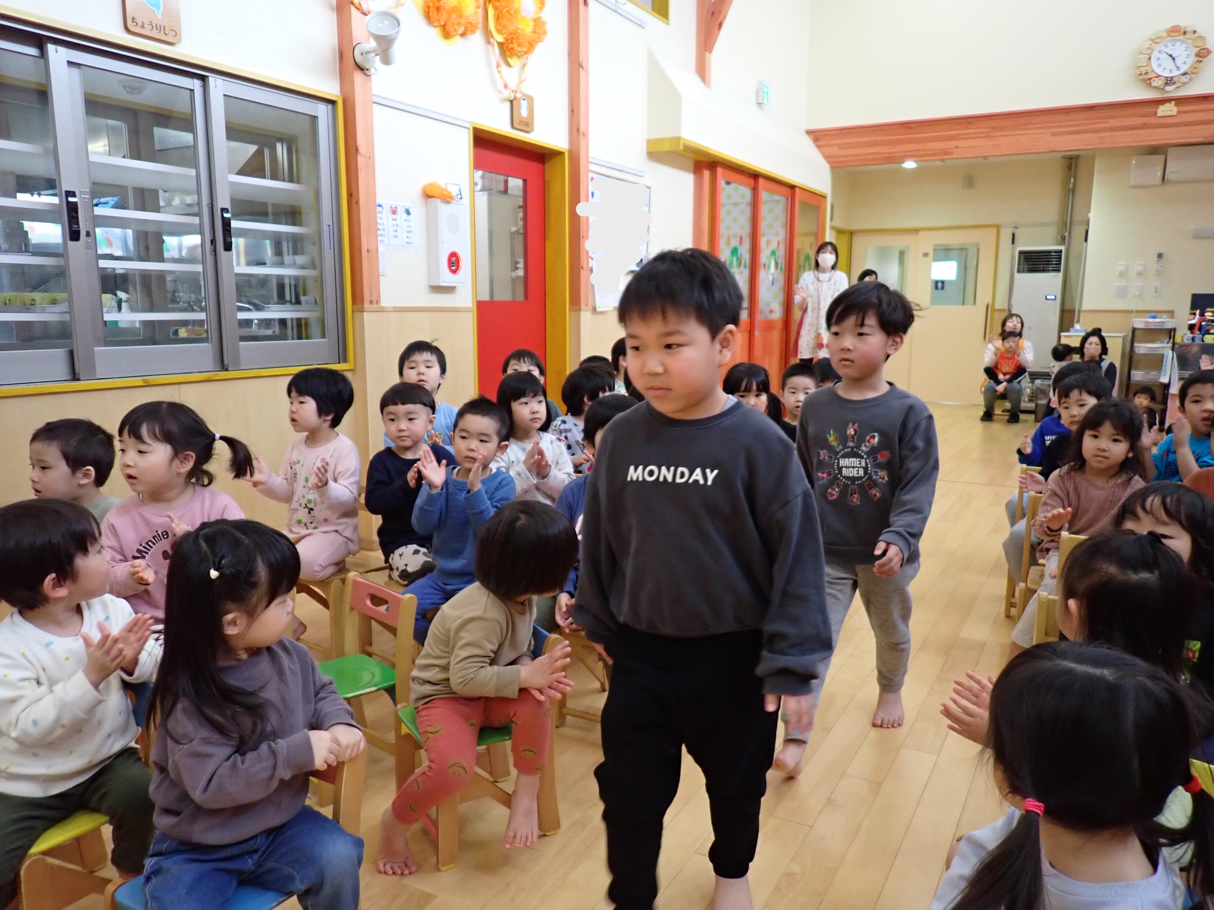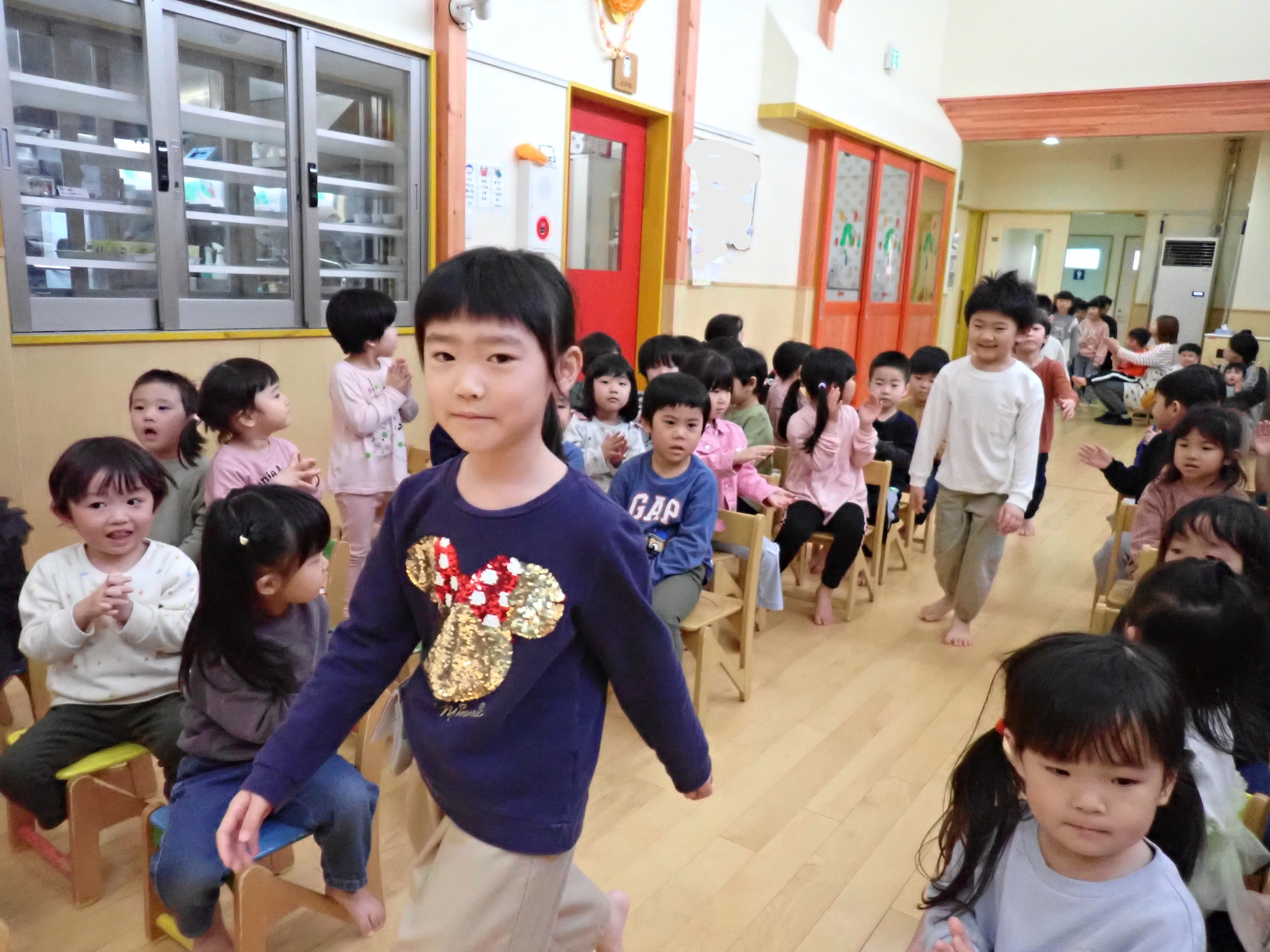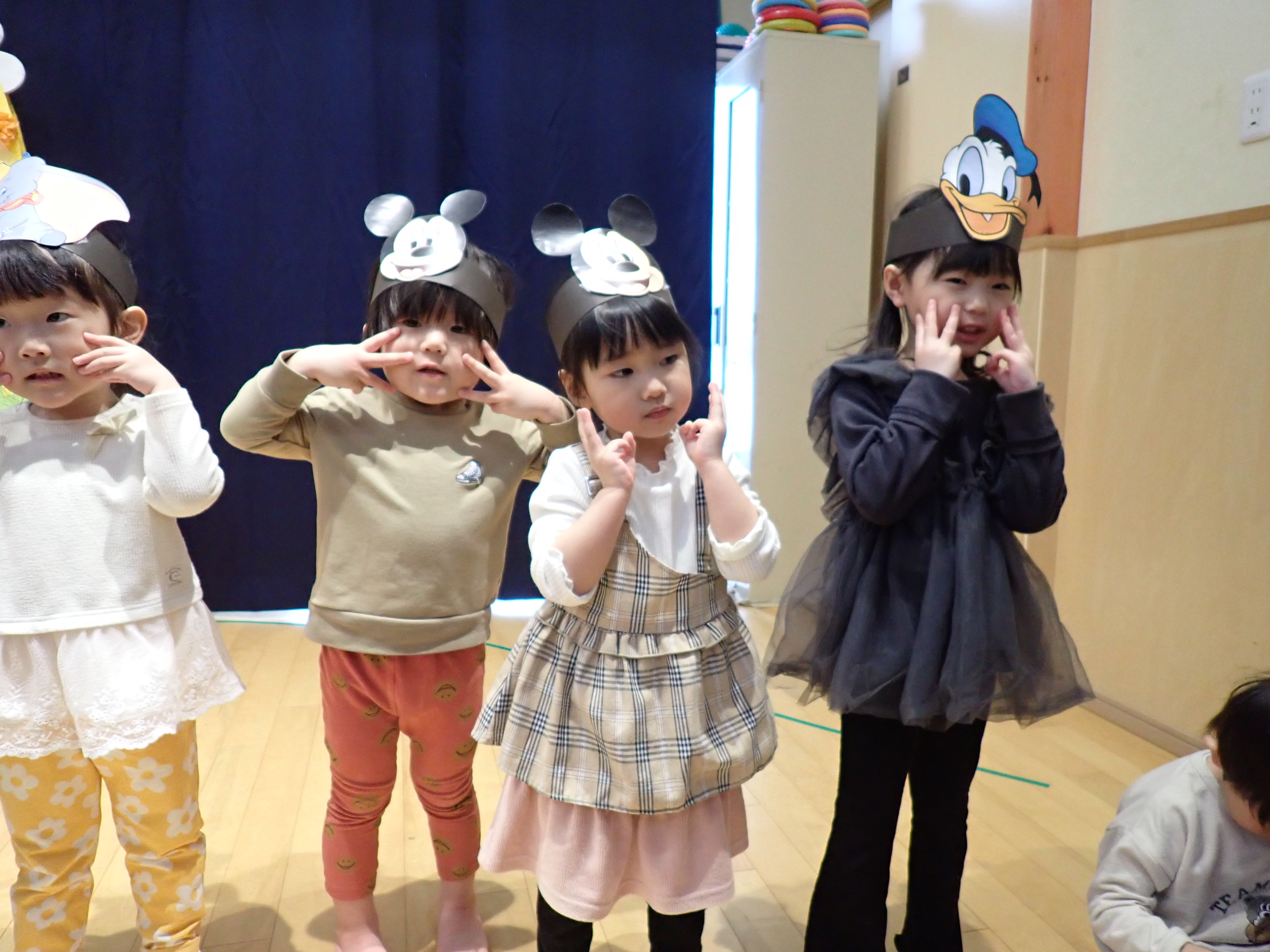 いよいよステージ発表!もも組は「ミッキーの手遊び」と歌を披露。