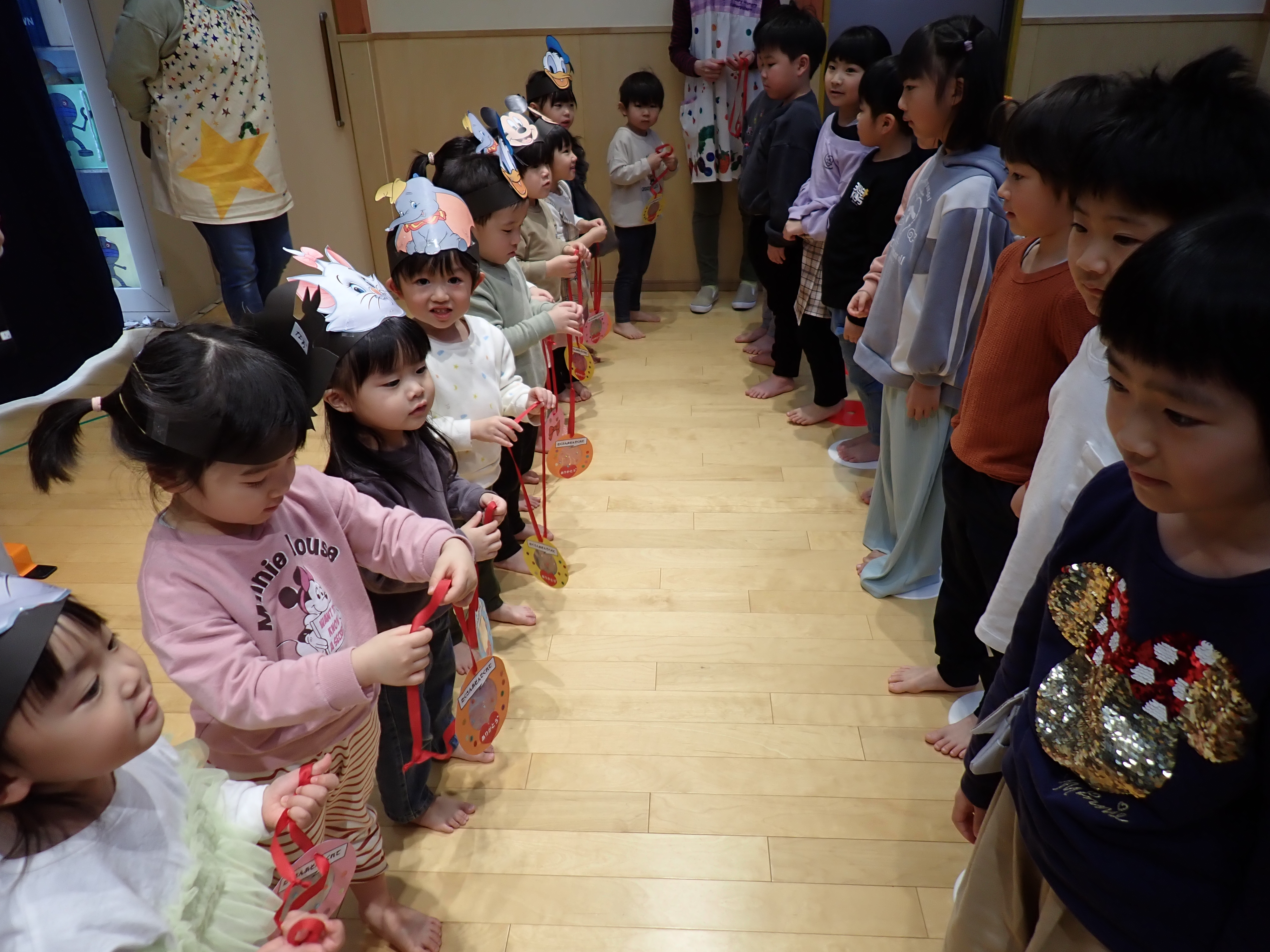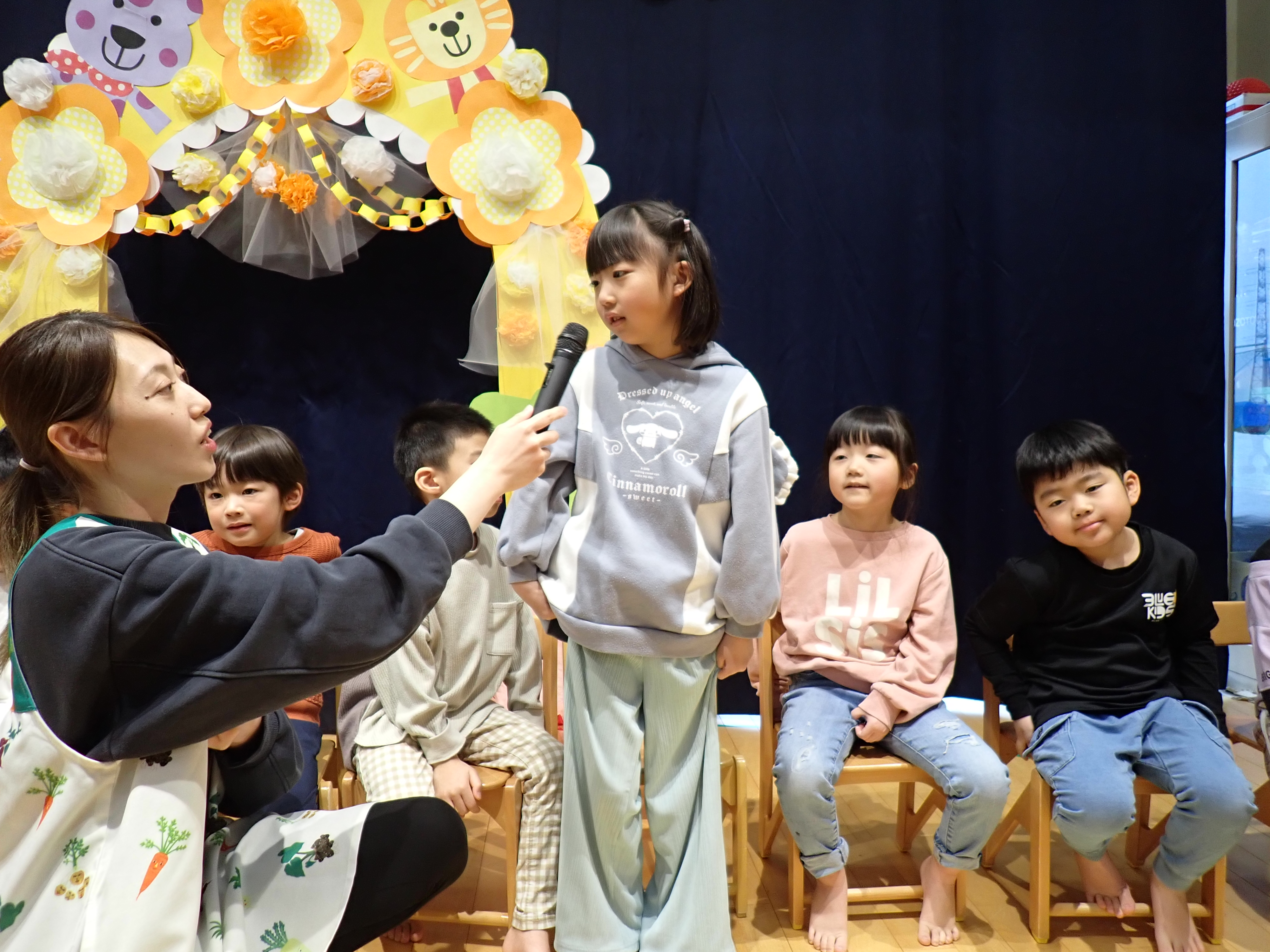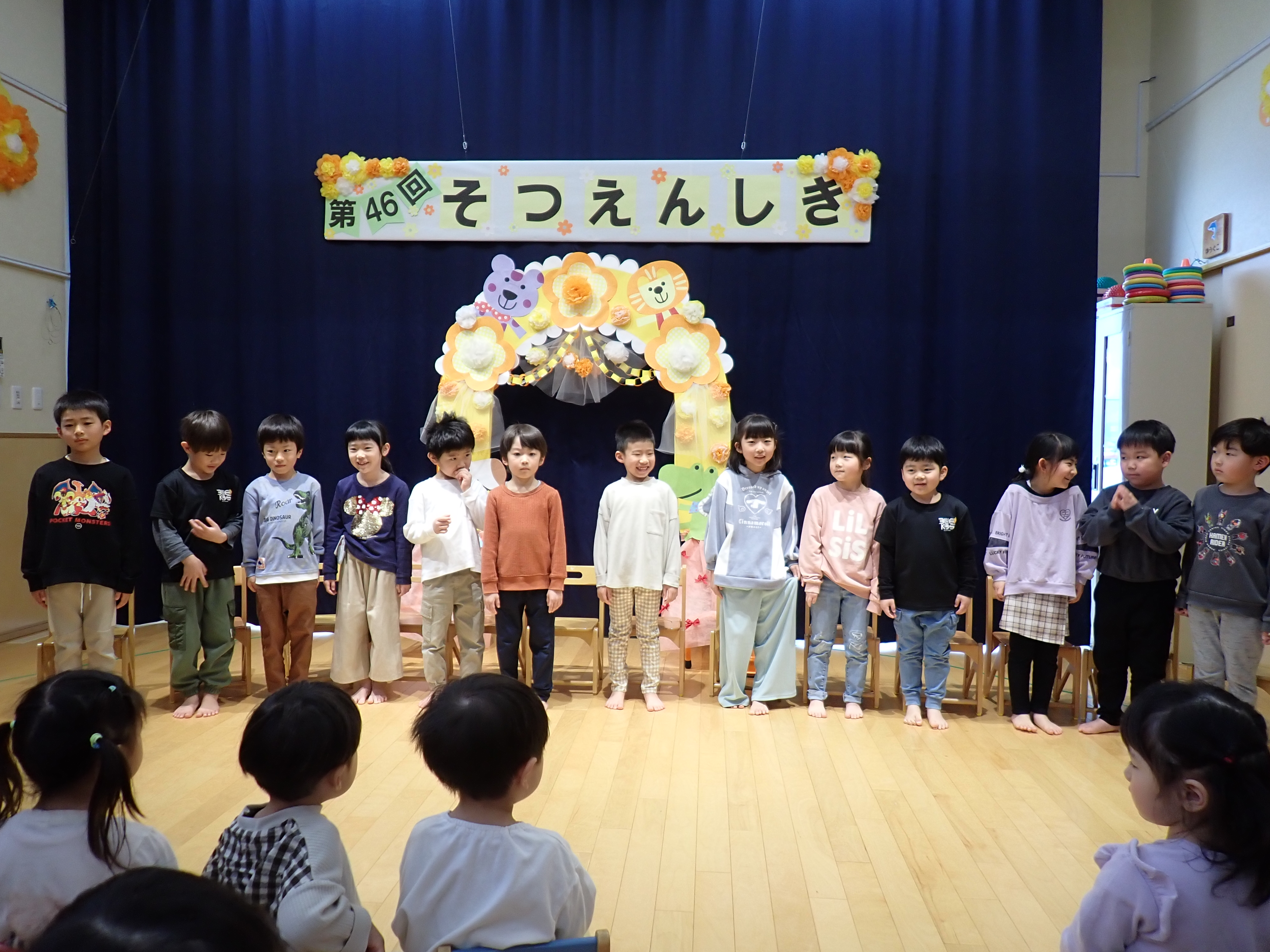 いよいよステージ発表!もも組は「ミッキーの手遊び」と歌を披露。