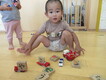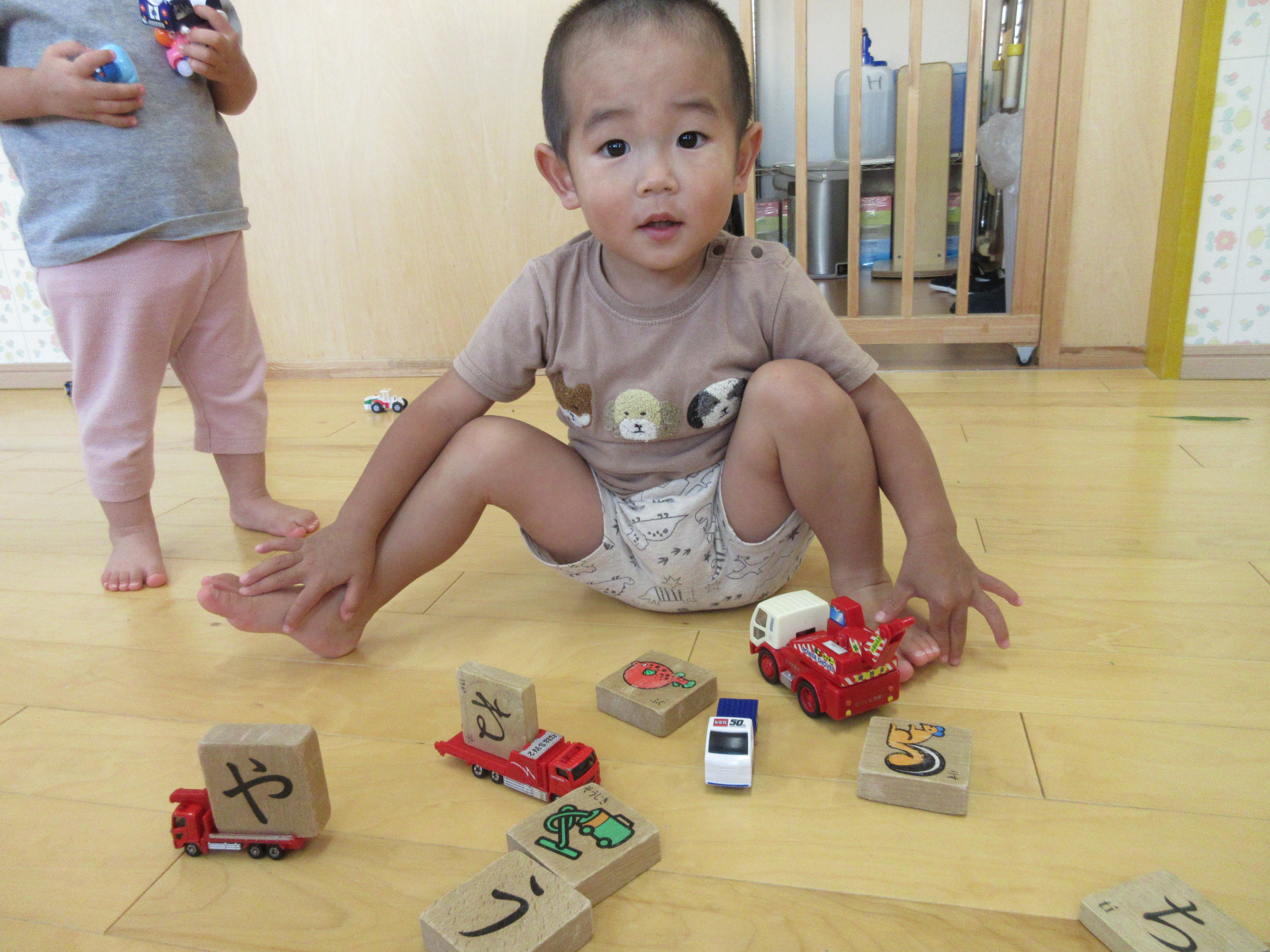 ミニカーの荷台に積み木を乗せて「出発しまーす」