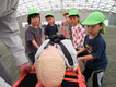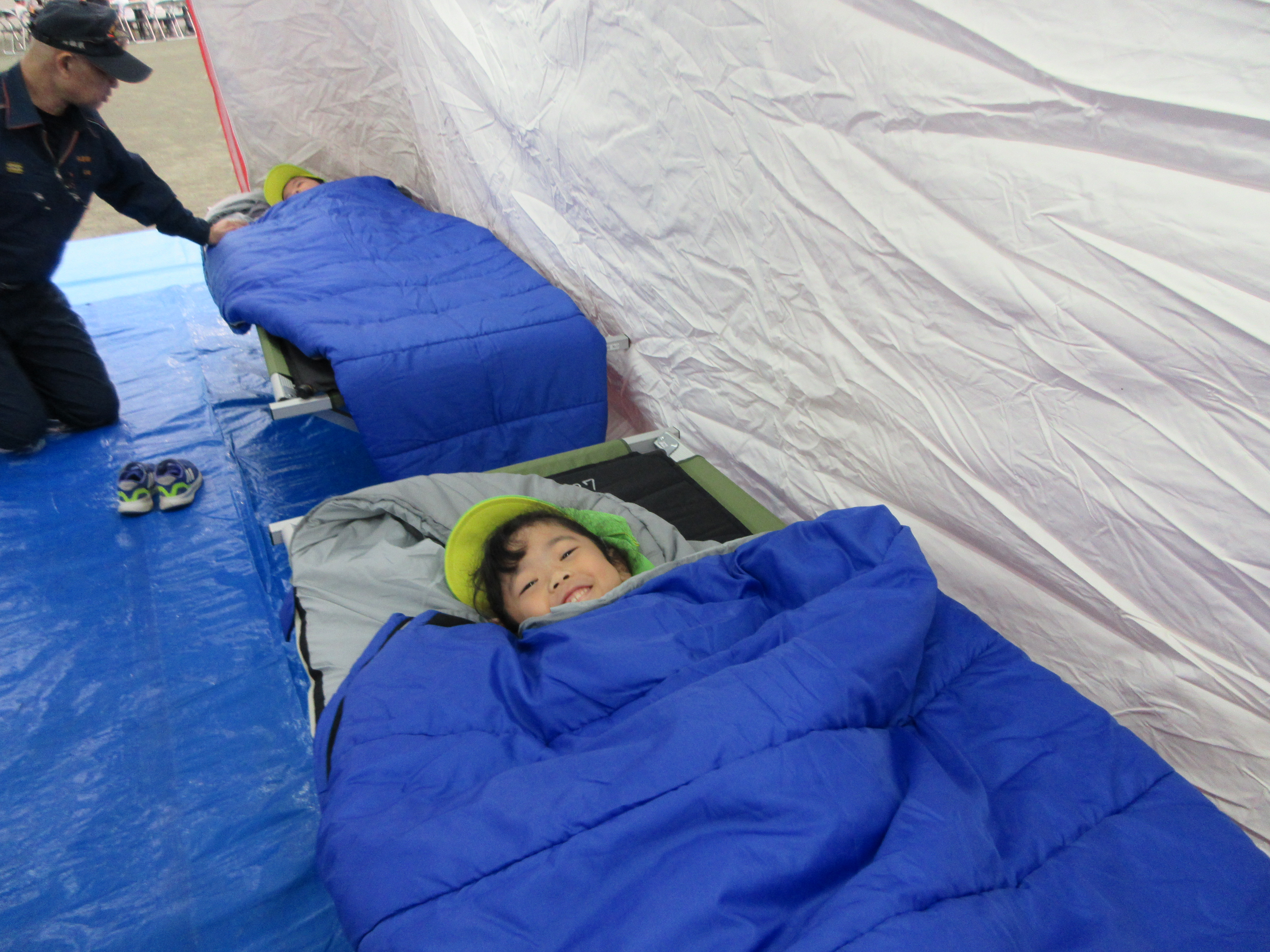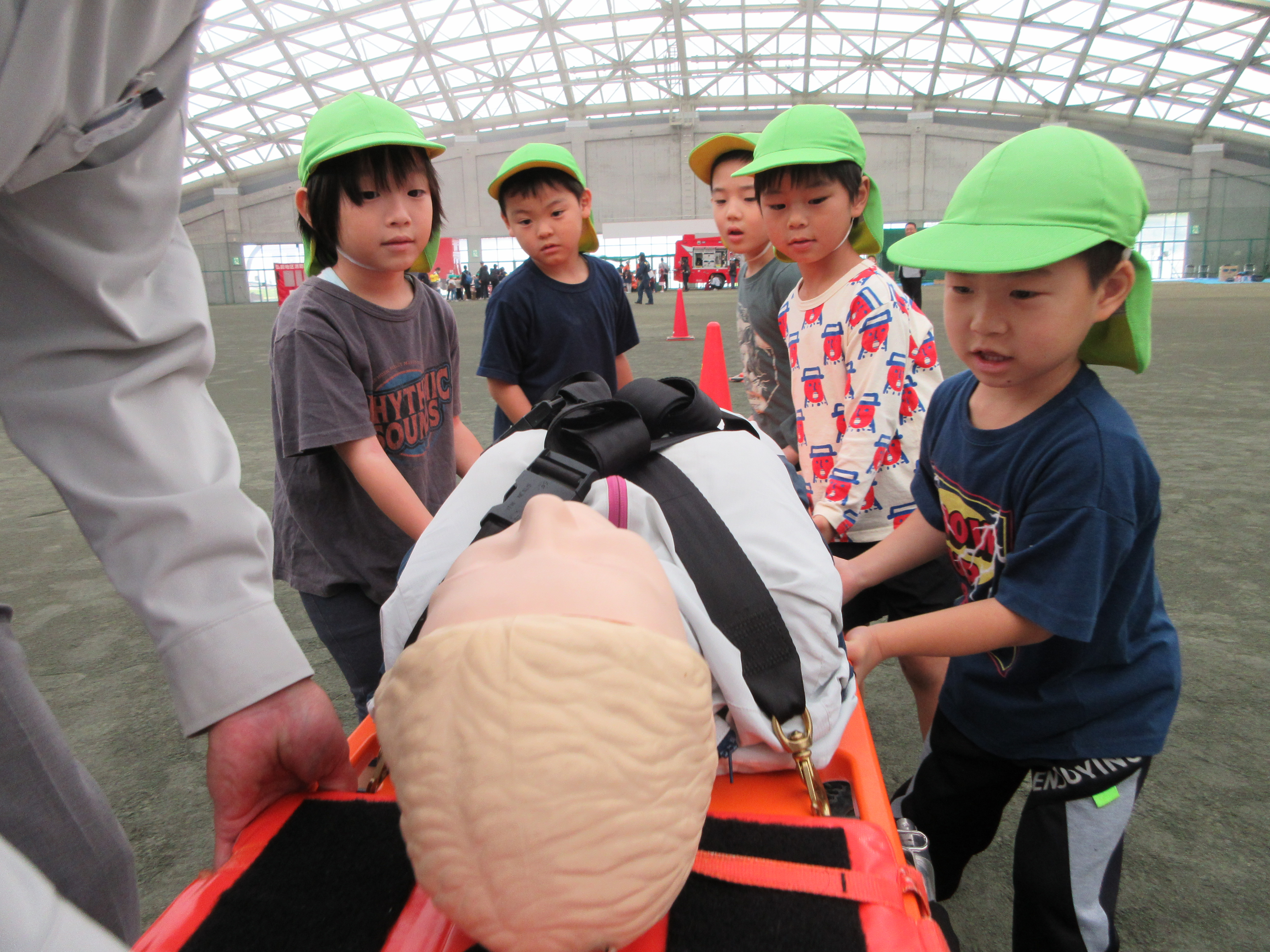 「救命体験コーナー」担架に乗せてゆっくり運びます。